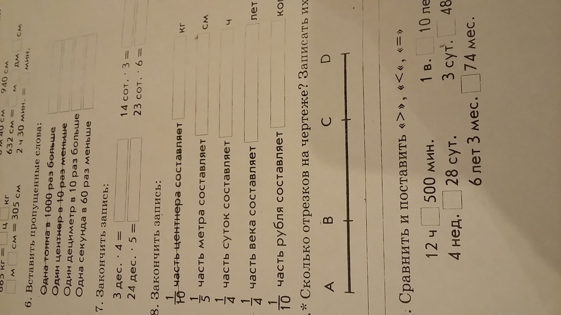 Закончи запись: 1/5 часть метра составляет .... см, 1/4 часть суток составляет .....ч, 1/4 часть века составляет ....лет,1/10 часть рубля составляет ....коп