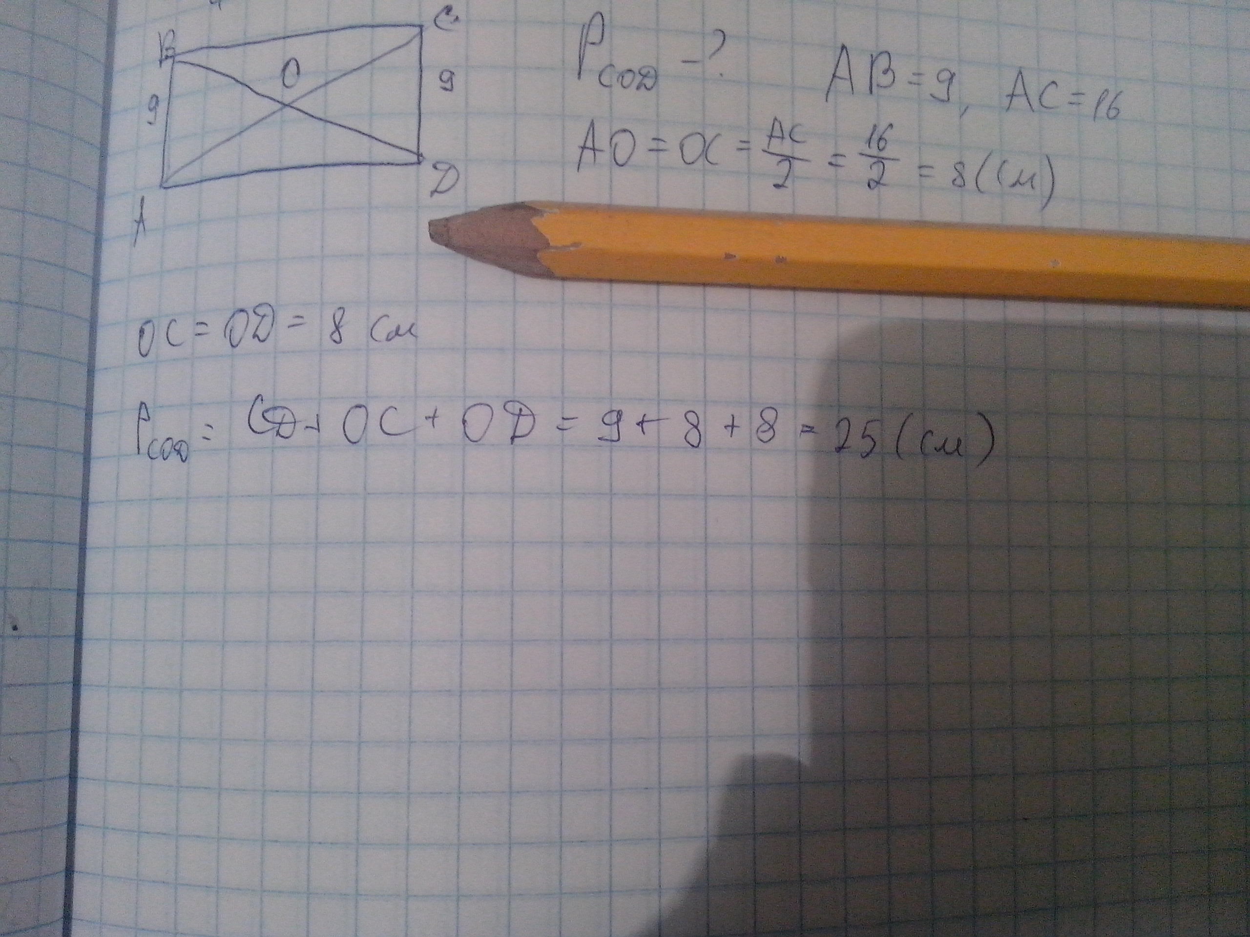 у прямокутнику АВСD ДИАГОНАЛИ ПЕРЕТИНАЮТЬСЯ в точци О . АВ=9см ,АС=16 см . знайдить периметр трикутника СОD ?