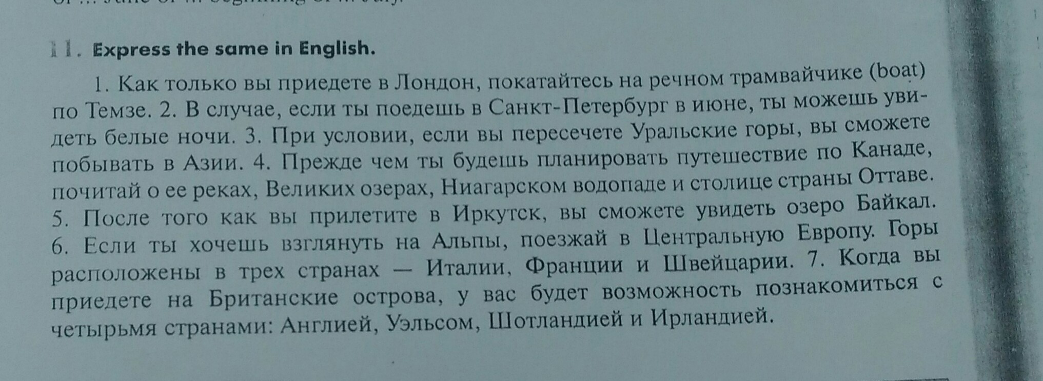 As soon as you come to London, you should ride on a boat along the river. If you go to St. Petersburg in June, you can see White Nights. If you cross the Ural Mountains, you can visit Asia. Before you start planning a trip to Canada, you should readabout its rivers, Great lakes, Niagaкф Falls and its capital Ottawa. After you've arrived to Irkutsk, you can see the lake Baikal. If you want to see the Alps, you can go to central Europe. Mountains are in three countries: Italy, France and Switzerland. Whe you arrive to british Islands, you'll be able to acquainted with four countries: England, Wales, Scotland and Ireland.