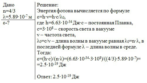 Вычислить массу фотона, если известно, что в среде с показателем преломления n=4/3 его длина волны 5,89*10⁻⁷ м.