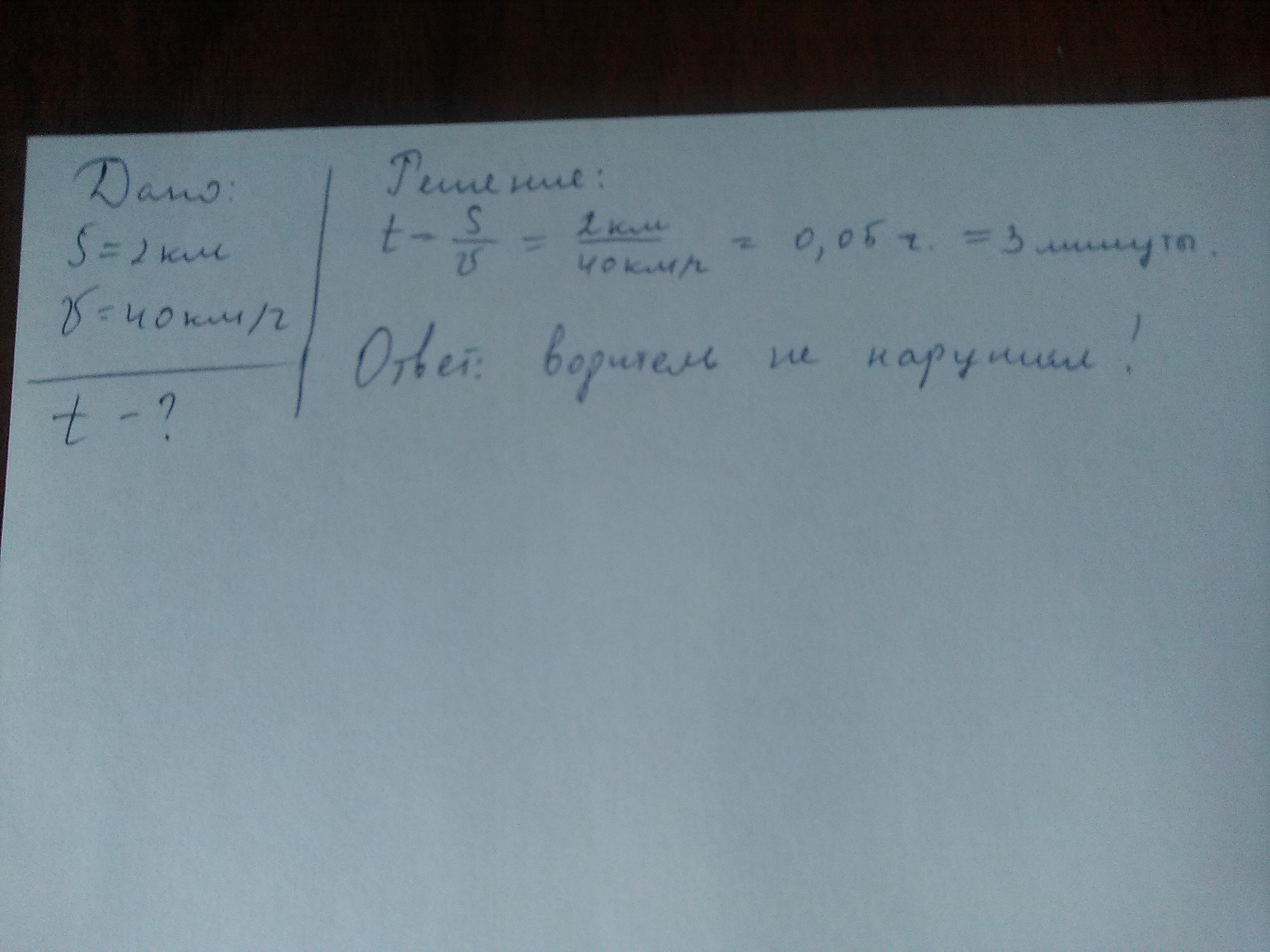 Помогите решить,срочно!!!. На Дороге установлен знак" На участке 2км скорость не больше 40 км / в час".Водитель проехал этот путь за 3 минуты.Проверь не нарушил ли водитель правило уличного движения