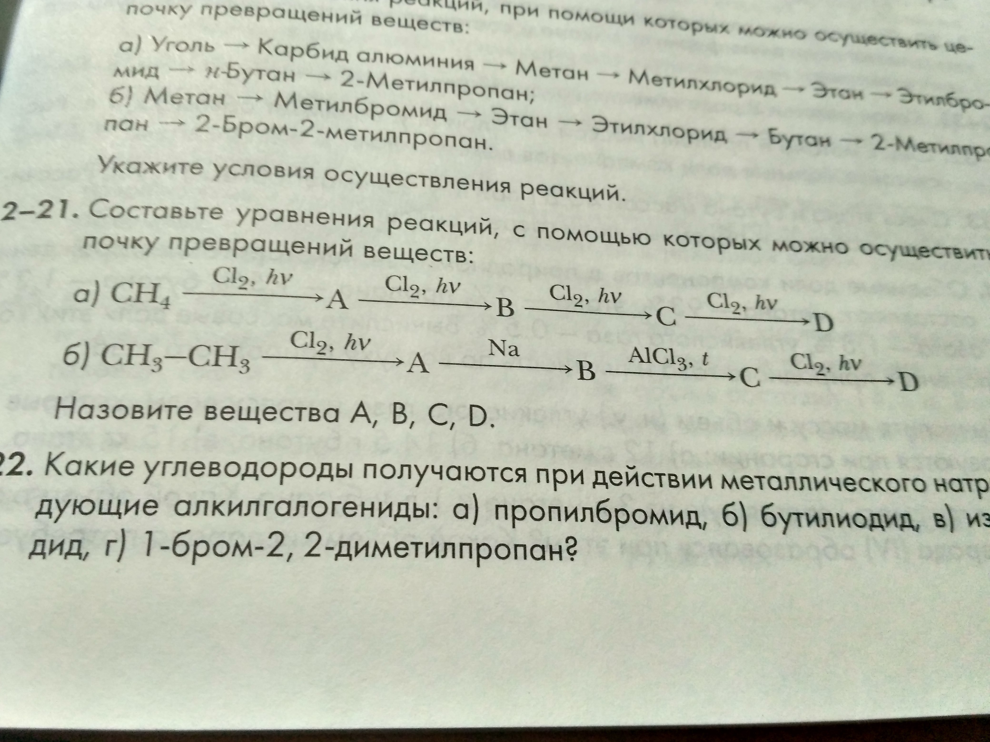 б) CH3-CH3 + Cl2 + hν = CH3-CH2-Cl + HCl хлорэтан