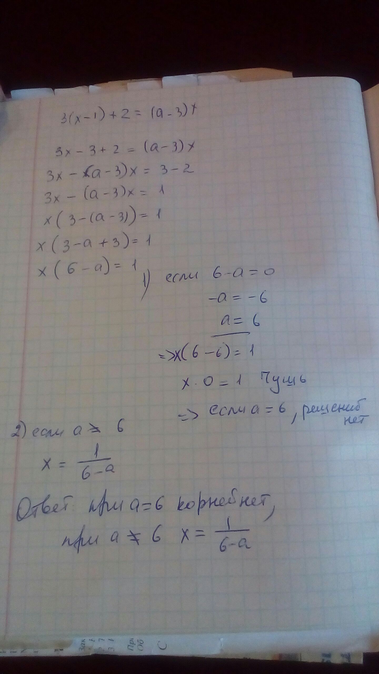Ответ: а) x=5/(6-a); б) при a=6 - корней нет.
