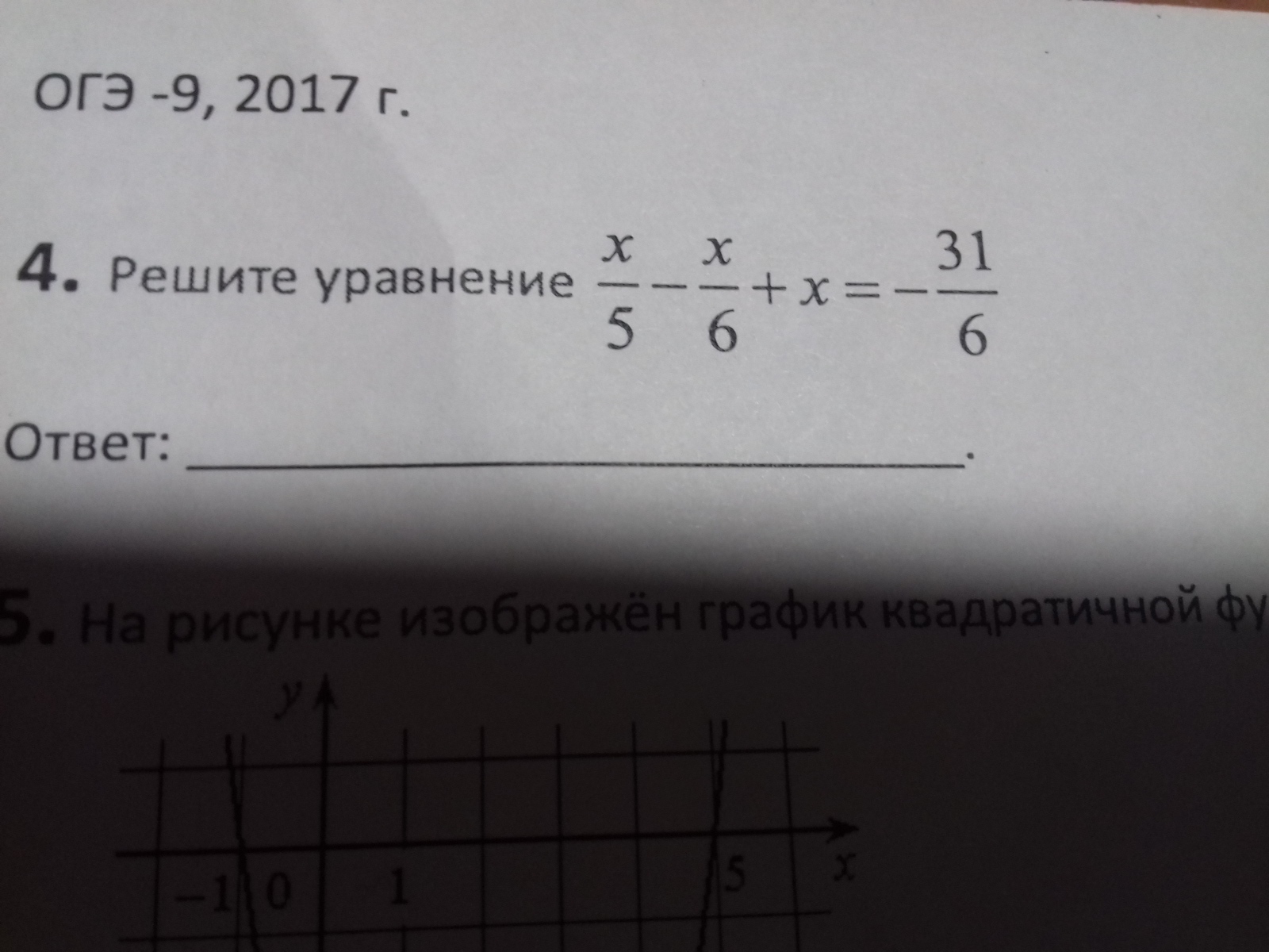 frac{x}{5} - frac{x}{6} + x =- frac{31}{6} \frac{6x}{30} - frac{5x}{30} + frac{30x}{30} =- frac{155}{30} \ 6x-5x+30x+155=0 \ 31x=-155 \ x=-5