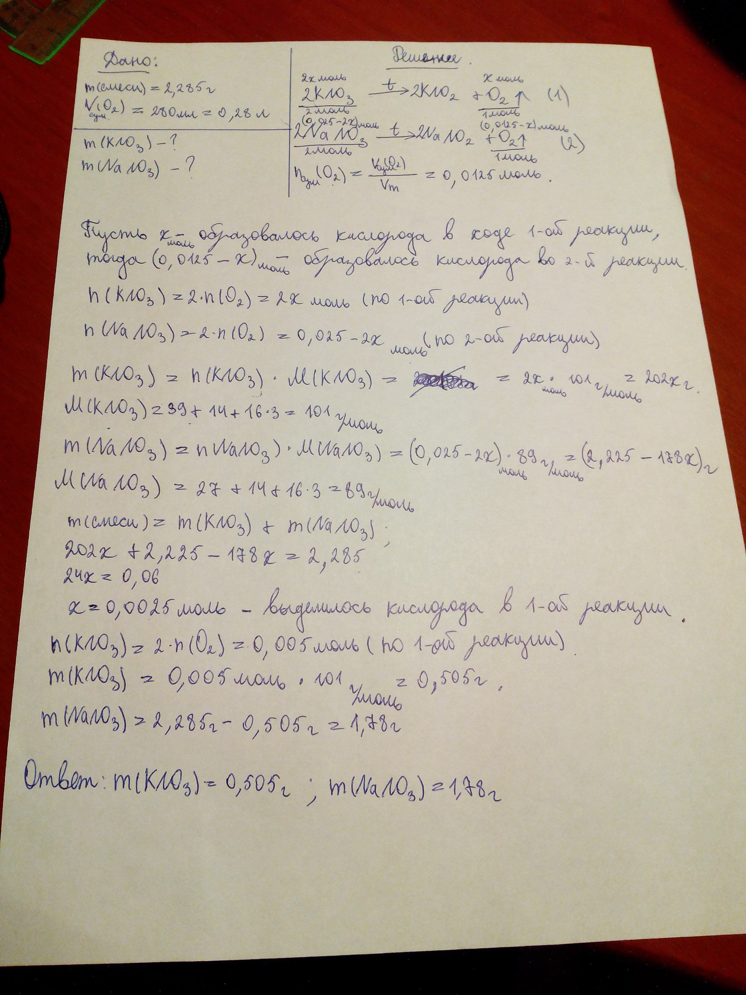 В лаборатории перемешались порошки нитратов калия и натрия. Чтобы определить состав образовавшейся смеси, лаборант прокалил образец массой 2,285 г до прекр