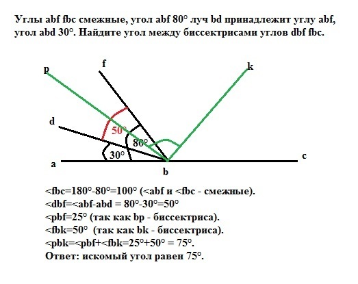 Углы abf fbc смежные, угол abf 80° луч bd принадлежит углу abf, угол abd 30° найдите угол между биссектрисами углов dbf fbc