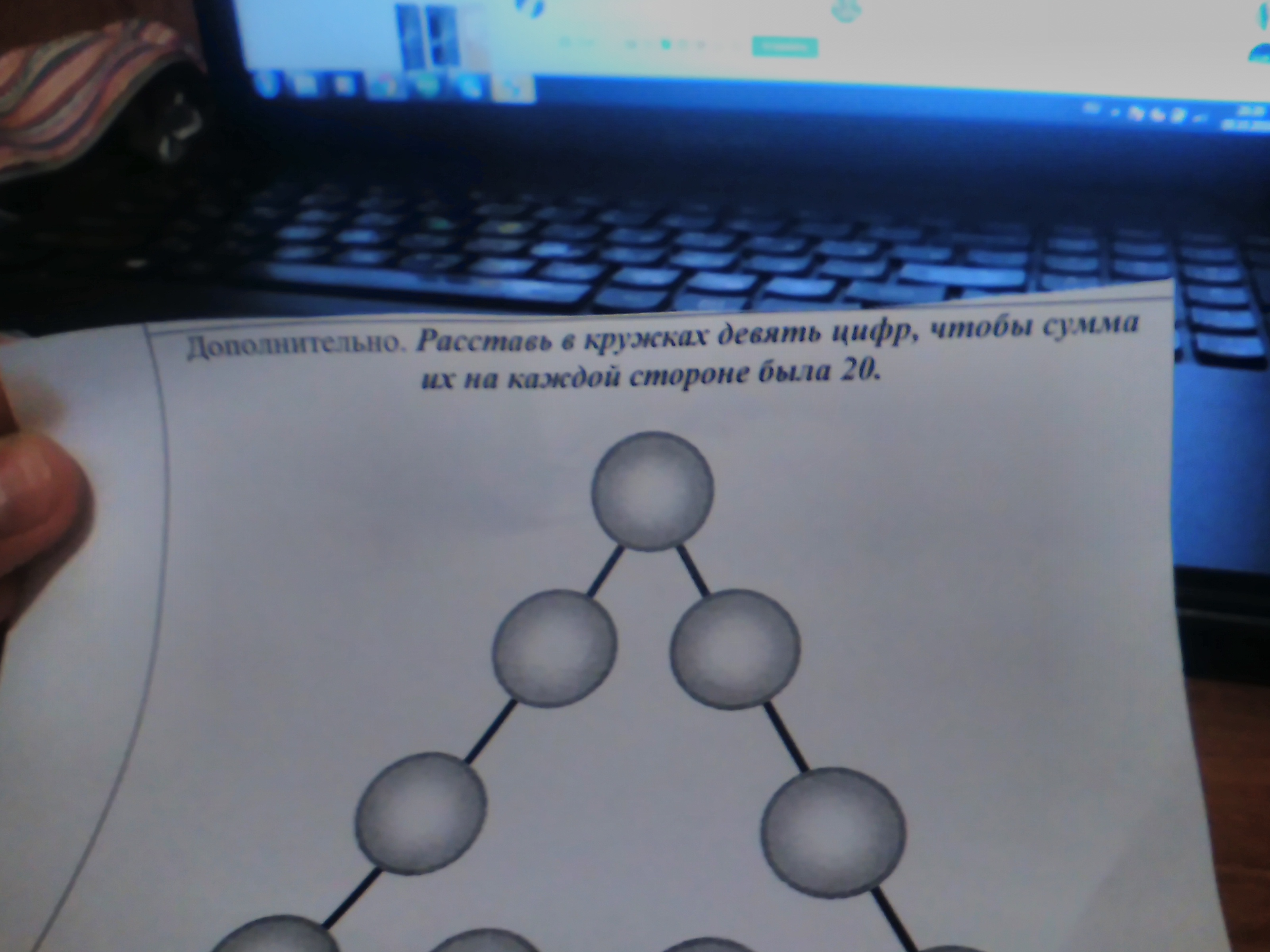 Помогите! Расставь в кружках девять цифр, чтобы сумма их на каждой стороне была 20. Чтоб цифры не повторялись! В треугольники сделать.