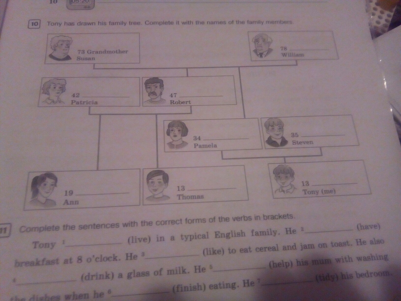 10. Тони нарисовал своё фамильное дерево. Впиши имена членов семьи.