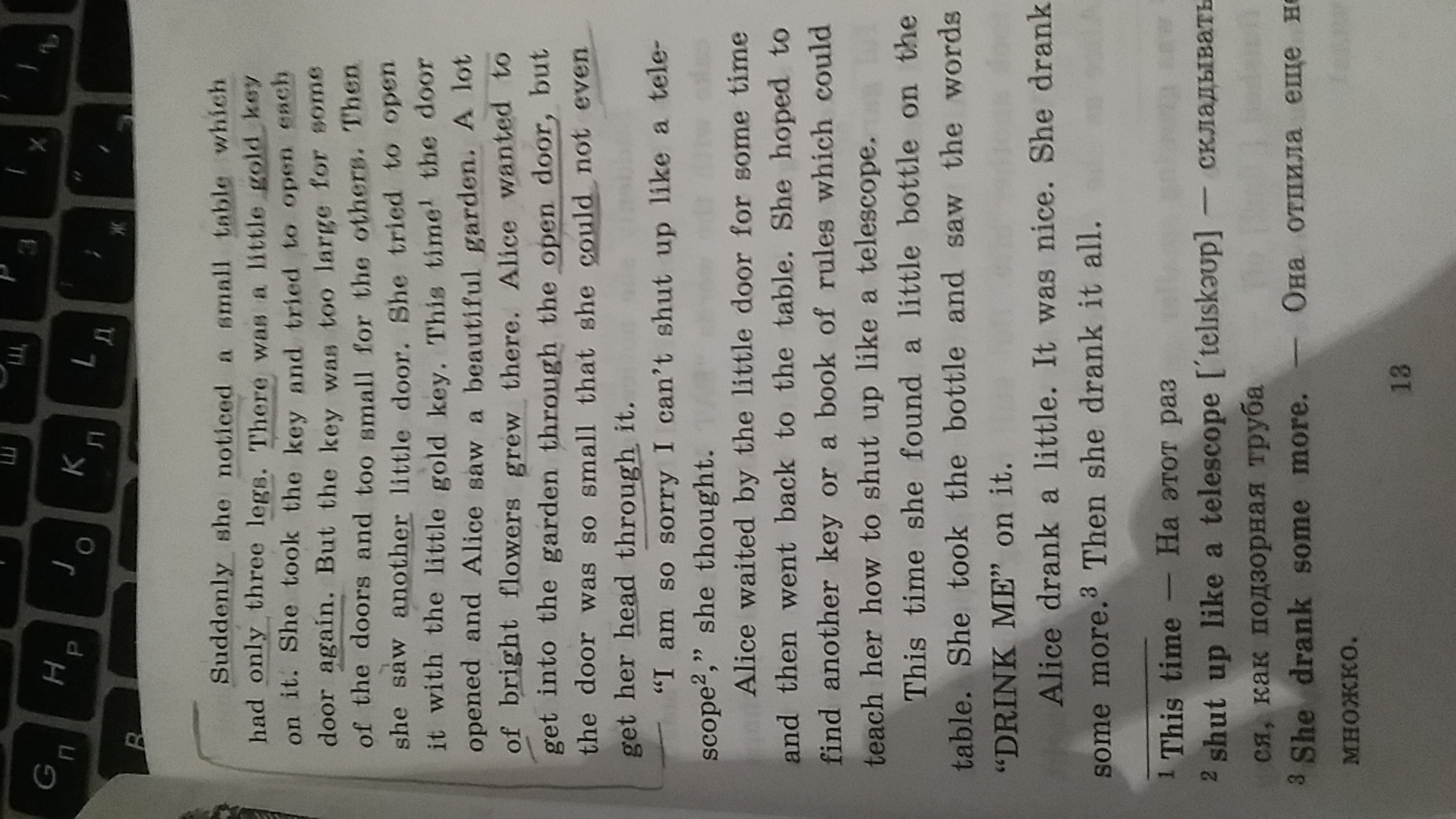 Вдруг она заметила маленький стол с тремя только ножками. На нём был(лежал) маленький золотой ключ. Она взяла ключ и постаралась открыть каждую дверь снова. Но ключ был такой большой (слишком велик) для одних дверей и слишком мал для других. Затем она увидела другую (ещё одну) дверь. Она постаралась (попыталась) открыть её маленьким золотым ключом. В это время дверь открылась и Алиса увидела прекрасный сад. Множество ярких цветов росли там. Алиса хотела войти в сад через открытую дверь, но дверь была так мала, что она не могла просунуть в неё даже голову.