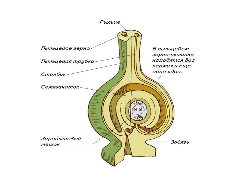 В завязь покрытосеменных растений проникает два спермия, один из них сливается с яйцеклеткой, дав начало диплоидному зародышу. Другой соединяется с центральной диплоидной клеткой. Образуется триплоидная клетка, из которой возникнет эндосперм - питательный материал для развивающегося зародыша. Этот процесс, характерный для всех покрытосеменных, открыт в конце прошлого века С.Г. Навашиным и получил название двойного оплодотворения. Значение двойного оплодотворения, по- видимому, заключается в том, что обеспечивается активное развитие питательной ткани уже после оплодотворения. Поэтому семяпочка у покрытосеменных не запасает питательных веществ впрок и, следовательно, развивается гораздо быстрее, чем у многих других растений, например у голосеменных