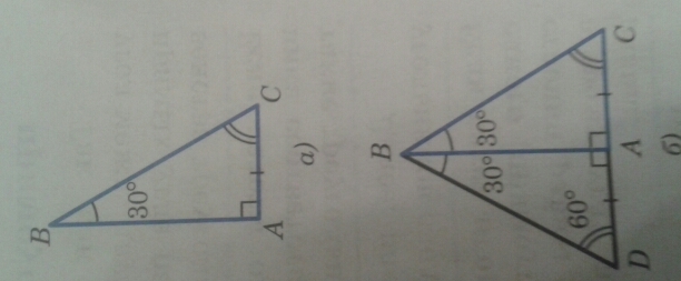 Рассмотрим прямоугольный треугольник ABC, в котором угол А- прямой, угол B- 30º и, значит, угол С- 60º (рис. а) Докажем, что АС=12 ВС. Приложим к треугольнику АВС равный ему треугольник ABD так, как показано на так, рисунке б. Получим треугольник BCD, в котором угол В= углу D=60º поэтому DC=BC. Но AC=1/2 DC. Следовательно, АС=1/2ВС, что и требовалось доказать.