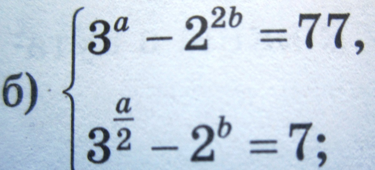 В первой системе замените "3 в степени а" на х, а "2 в степени b" на у. Тогда первое уравнение примет вид x - y^2 = 77. Второе "квадратный корень из х - у = 7". Решая, получим: х = 81 (тогда а = 3) и у = 2 (тогда в = 1). Ответ: (81;1)