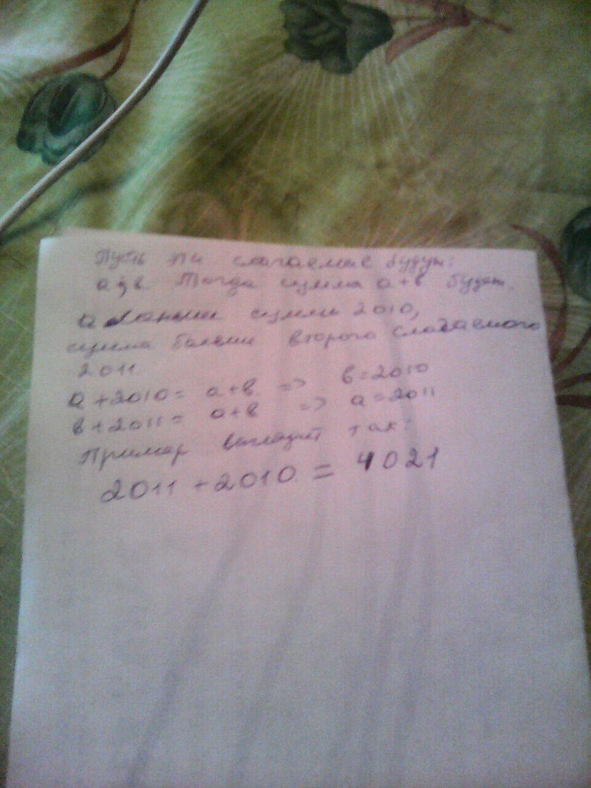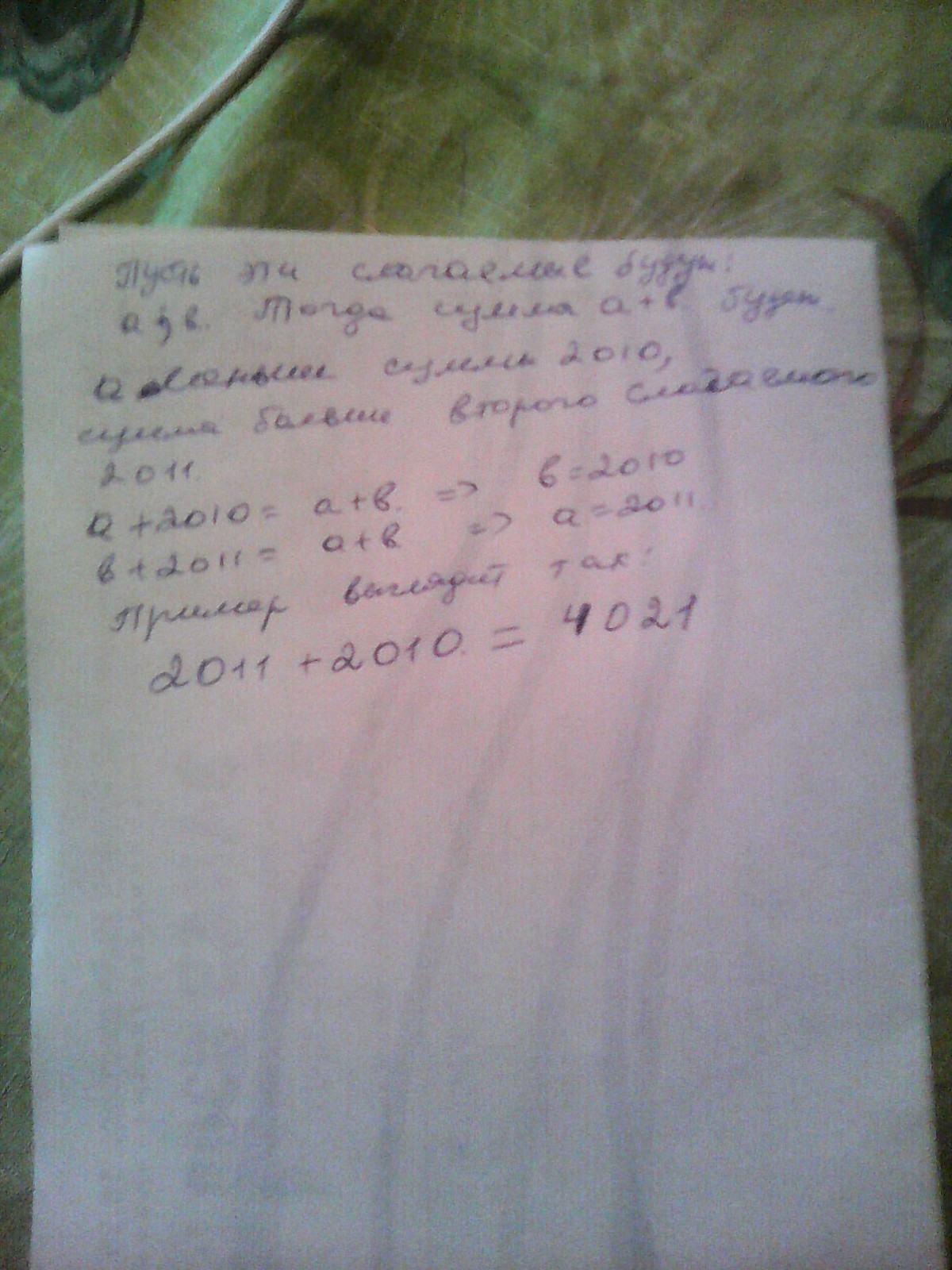 в примере на сложение двух чисел первое слагаемое меньше суммы на 2 010,а сумма больше второго слагаемого на 2 011.Восстановите пример