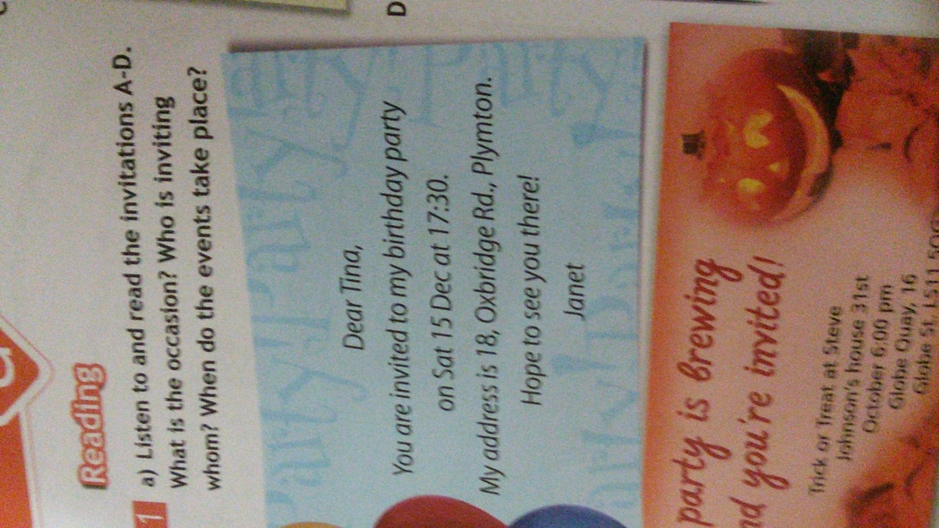 Дорогая Тина,ты приглашена на вечеринку в честь моего дня рождения в субботу 15 декабря в 17 30,мой адрес-дом 18 по дороге оксбрайдж ,плимтон,надеюсь тебя там увидеть,жанет