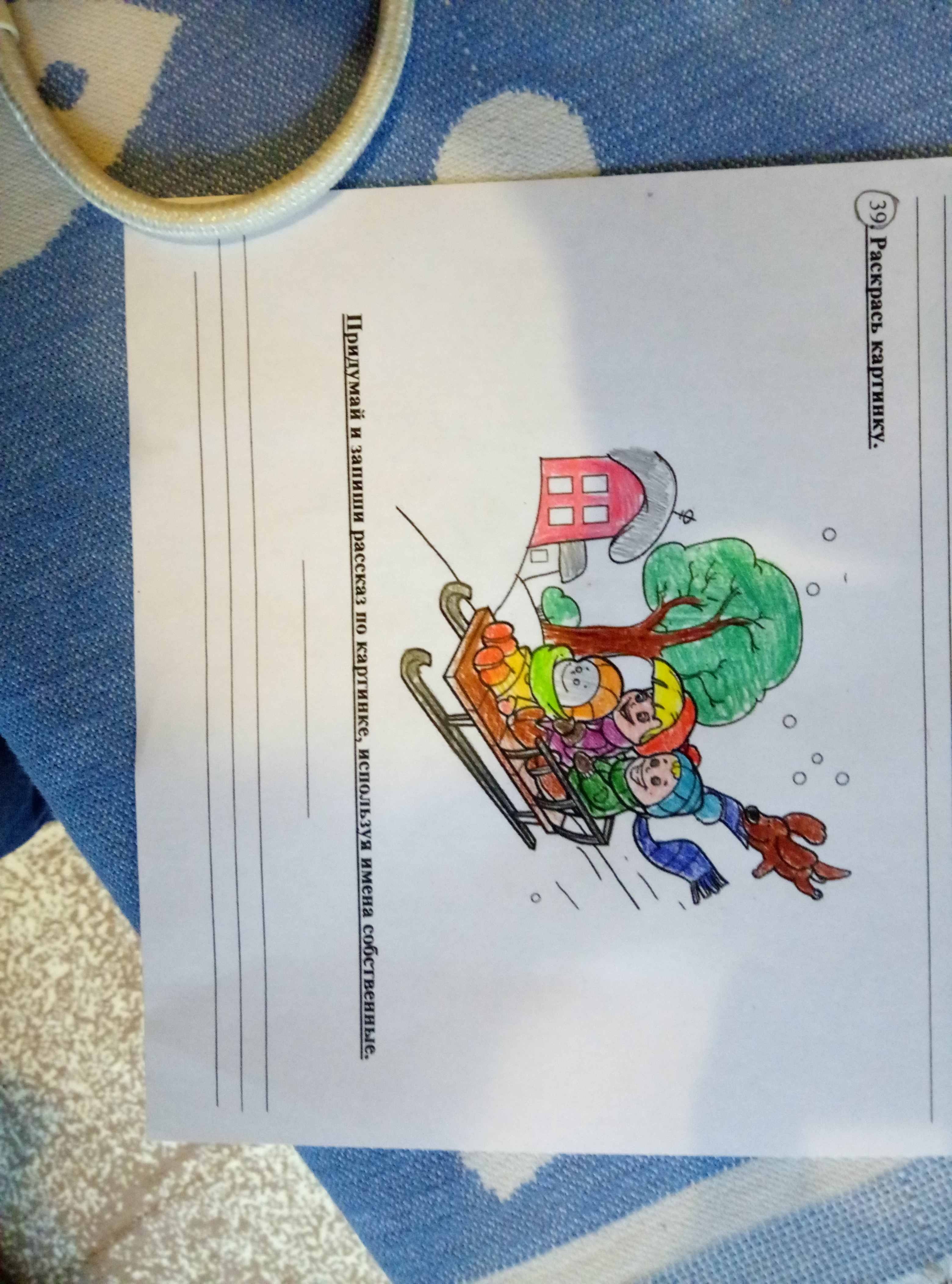 Саша,Катя и Андрей катались на санках.Саша был маленький поэтому Катя его держала что бы он не упал.Андрею собака цеплялась за шарф потому что боялась за них.
