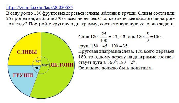 в саду росло 180 фруктовых деревьев сливы яблони и груши сливы составили 25 процентов а яблони 5/9 всех деревьев сколько деревьев каждого вида росло в саду ?Постройте круговую диаграмму соответствующую условию задачи,
