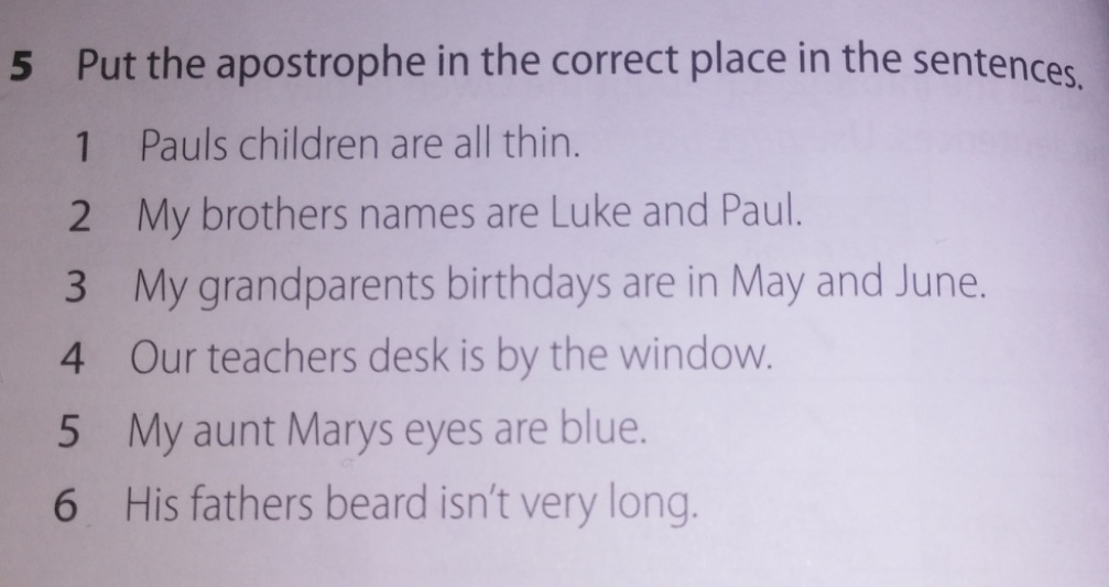 1. Paul's. 2. brother's. 3. grandparents'. 4. Teacher's. 5. Mary's. 6. father's.