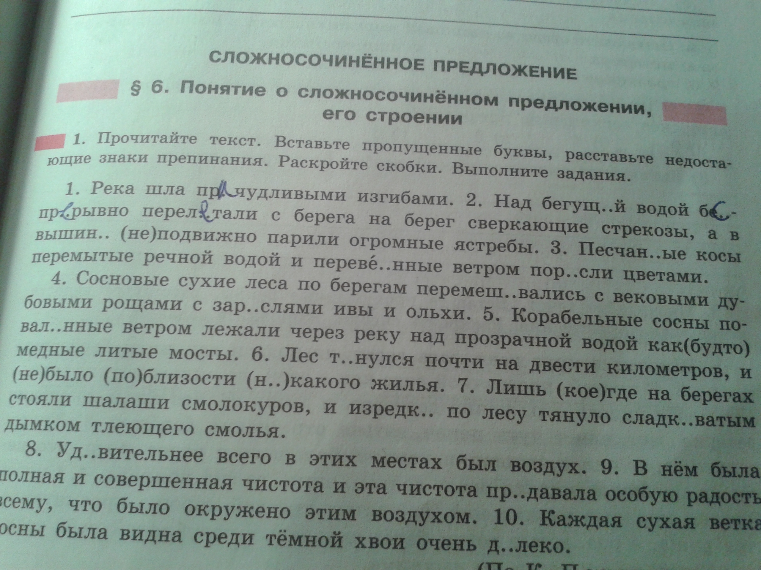 1. Река шла причудливыми изгибами. 2. Над бегущей водой беспрерывно перелетали с берега на берег сверкающие стрекозы, а в вышине неподвижно парили огромные ястребы. 3. Песчаные косы, перемытые речной водой и перевеянные ветром, поросли цветами.