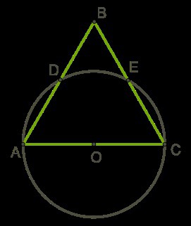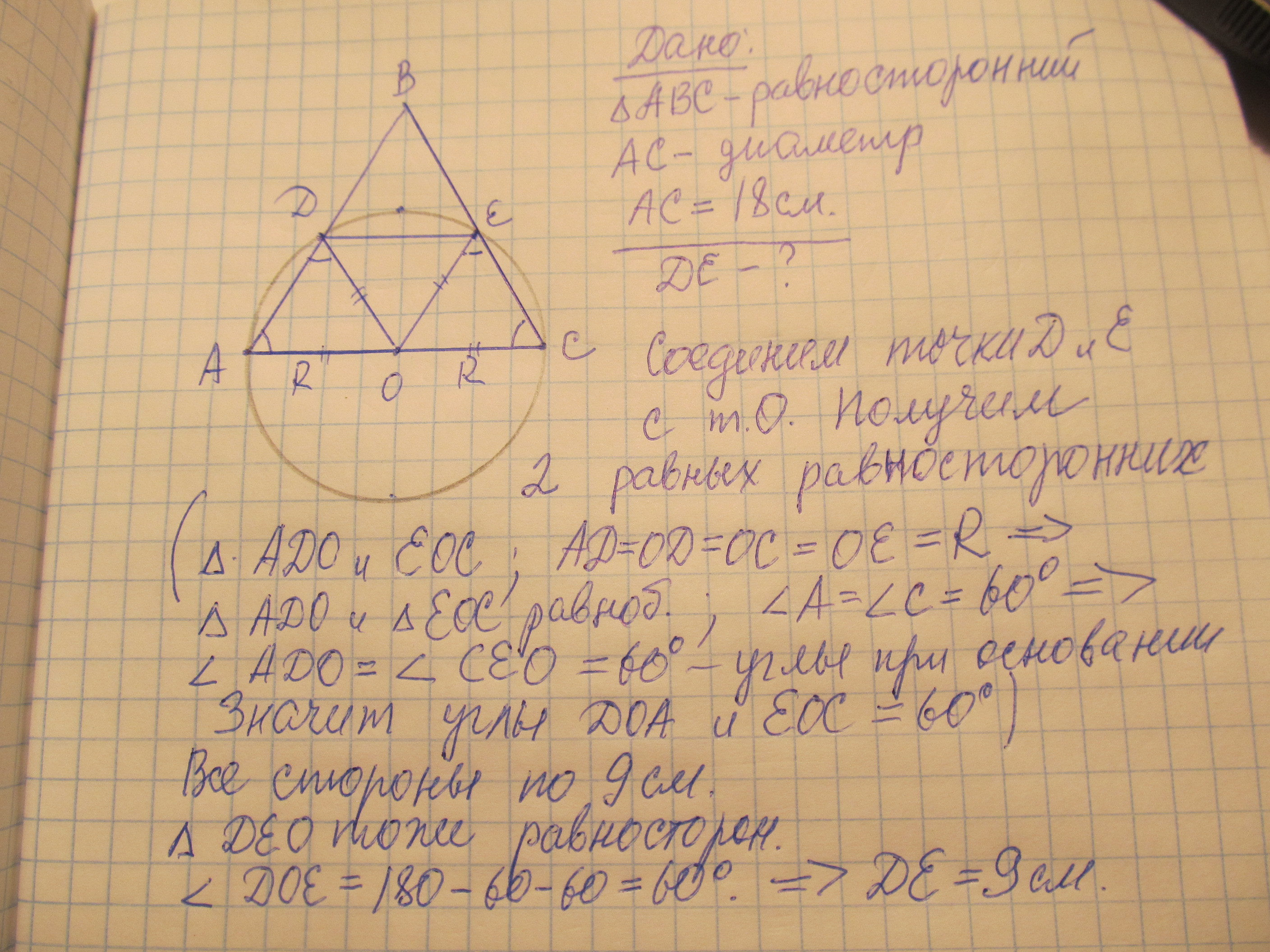 Сторона равностороннего треугольника AC длиной 18 см является диаметром окружности. Окружность пересекается с двумя другими сторонами в точках D и E. Определи длину DE.