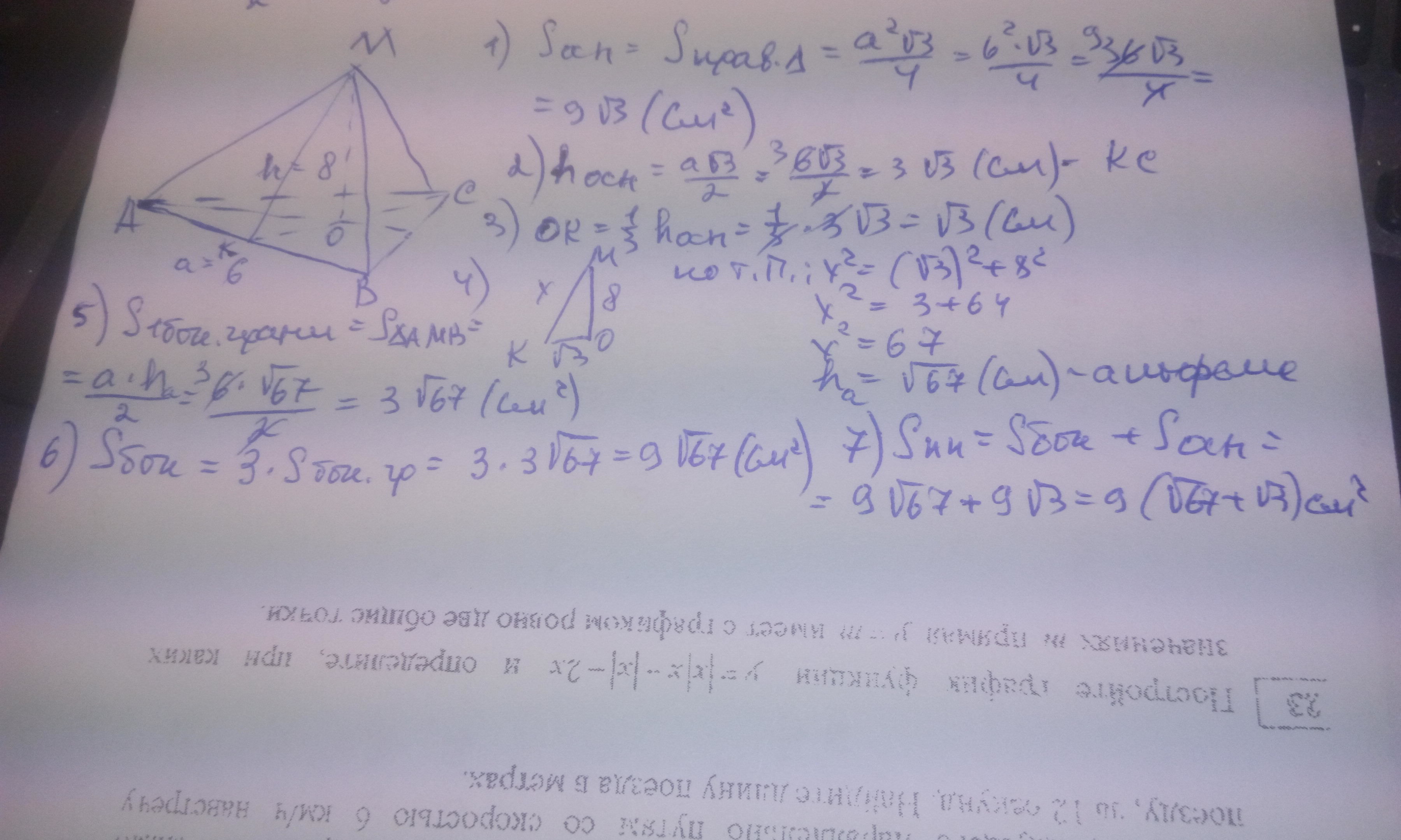 Сторона основания АВС правильной треугольной пирамиды МАВС равна 6 см, а отрезок соединяющий вершину М пирамиды с центром О основания,- 8 см. Найдите полную поверхность пирамиды
