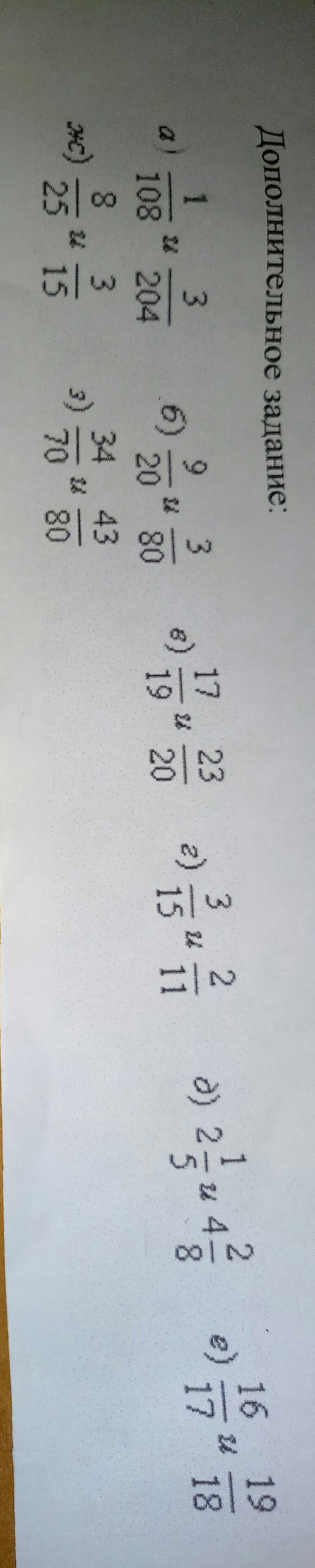 1) frac{1}{108}  textless    frac{3}{204}  \ 2)  frac{9}{20}  textgreater   frac{3}{80}  \  3) frac{17}{19}  textless   frac{23}{20}   \ 4) frac{3}{15}  textgreater   frac{2}{11}  \ 5) 2 frac{1}{5}   textless   4 frac{2}{8}  \ 6)  frac{16}{17}   textless   frac{19}{18}  \ 7)  frac{8}{25}  textgreater   frac{3}{15}  \ 8)  frac{34}{70}  textless   frac{43}{80}