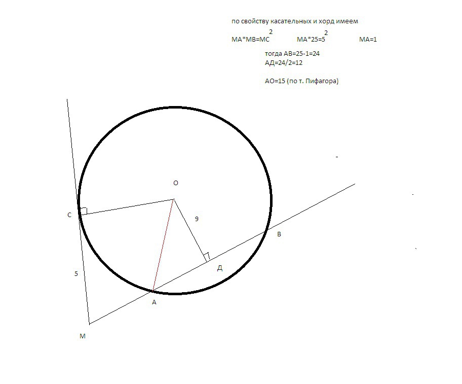 Найди радиус окружности, если известно, что MB равен 25 см и MC равен 5 см.