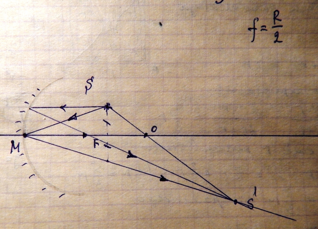 От S в нижнюю полуплоскость откладываем равный отрезок. Соединяем полученную точку с S' до пересечения с ОО. Получаем точку М - полюс зеркала. ОМ делим пополам получаем фокус.