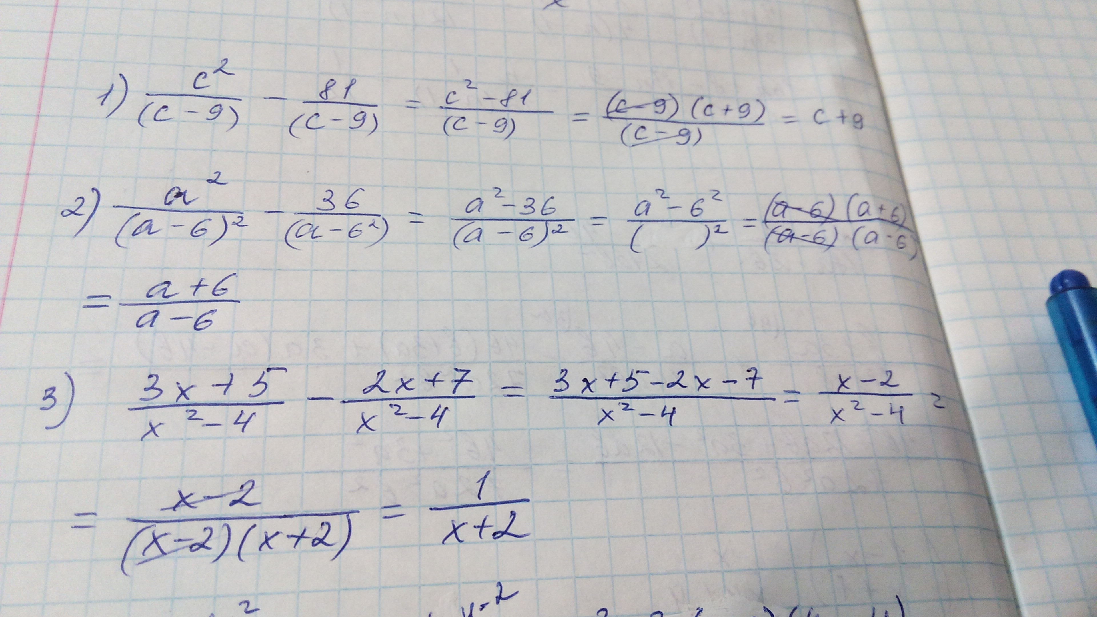 Выполните действия: c^2/c-9 - 81/c-9; a^2/(a-6)^2 - 36/(a-6)^2; 3x+5/x^2-4 - 2x+7/x^2-4; y^2/y-2 - 4y-4/y-2