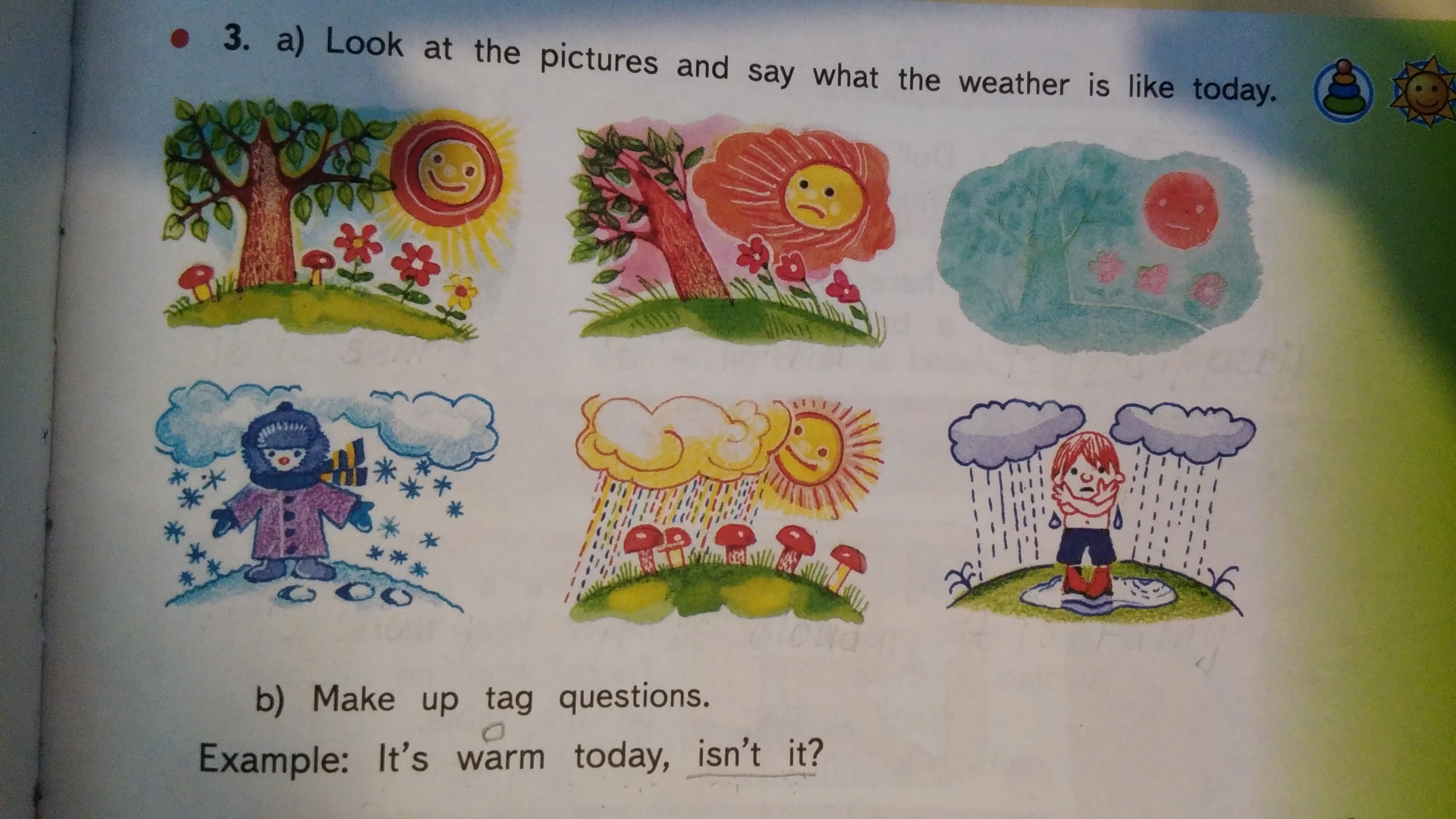 1. Its Sunny today 2. Its Windy today 3. Its Cloudy today 4. Its Snowy today 5. its Rainy today 6. its storm today