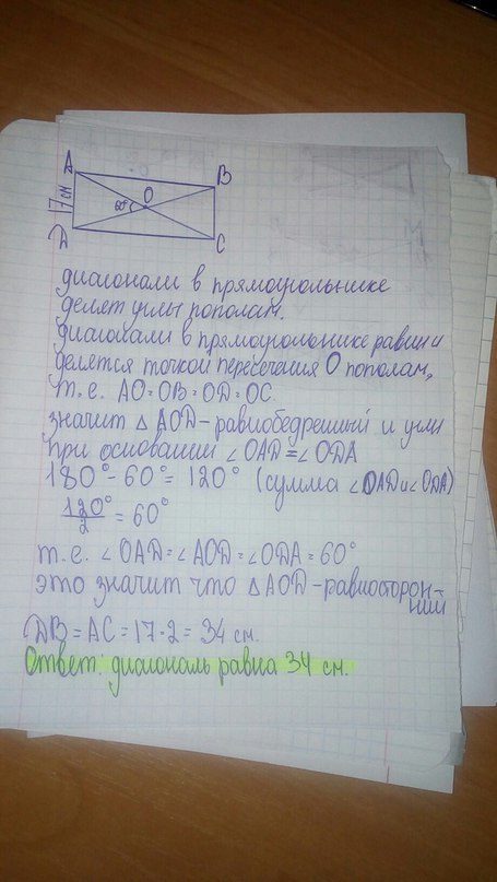 Диагонали прямоугольника пересекаются под углом 60 градусов. Найдите его диагонали , если меньшая сторона прямоугольника равна 17 см .
