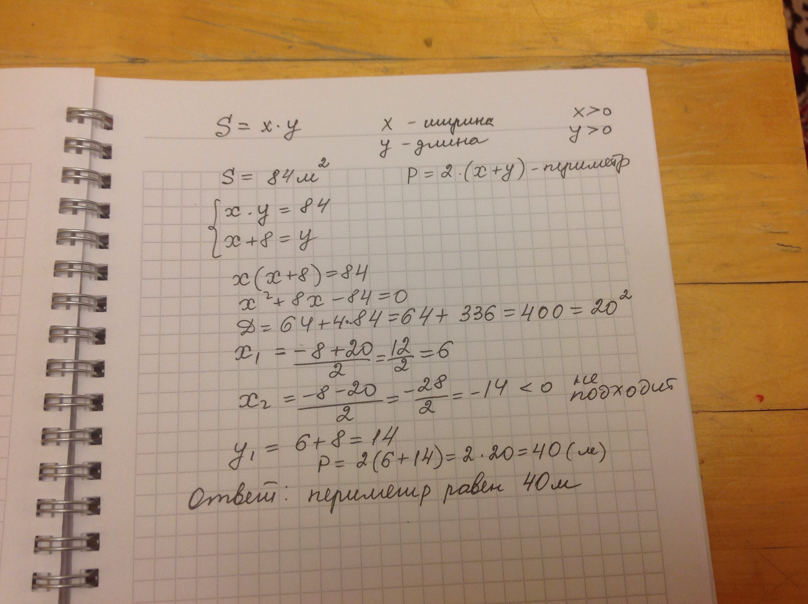 Решить системой. Участок имеет форму прямоугольника, площадь которого равна 84м^2. Найдите периметр участка, если его длина больше ширины на 8м.