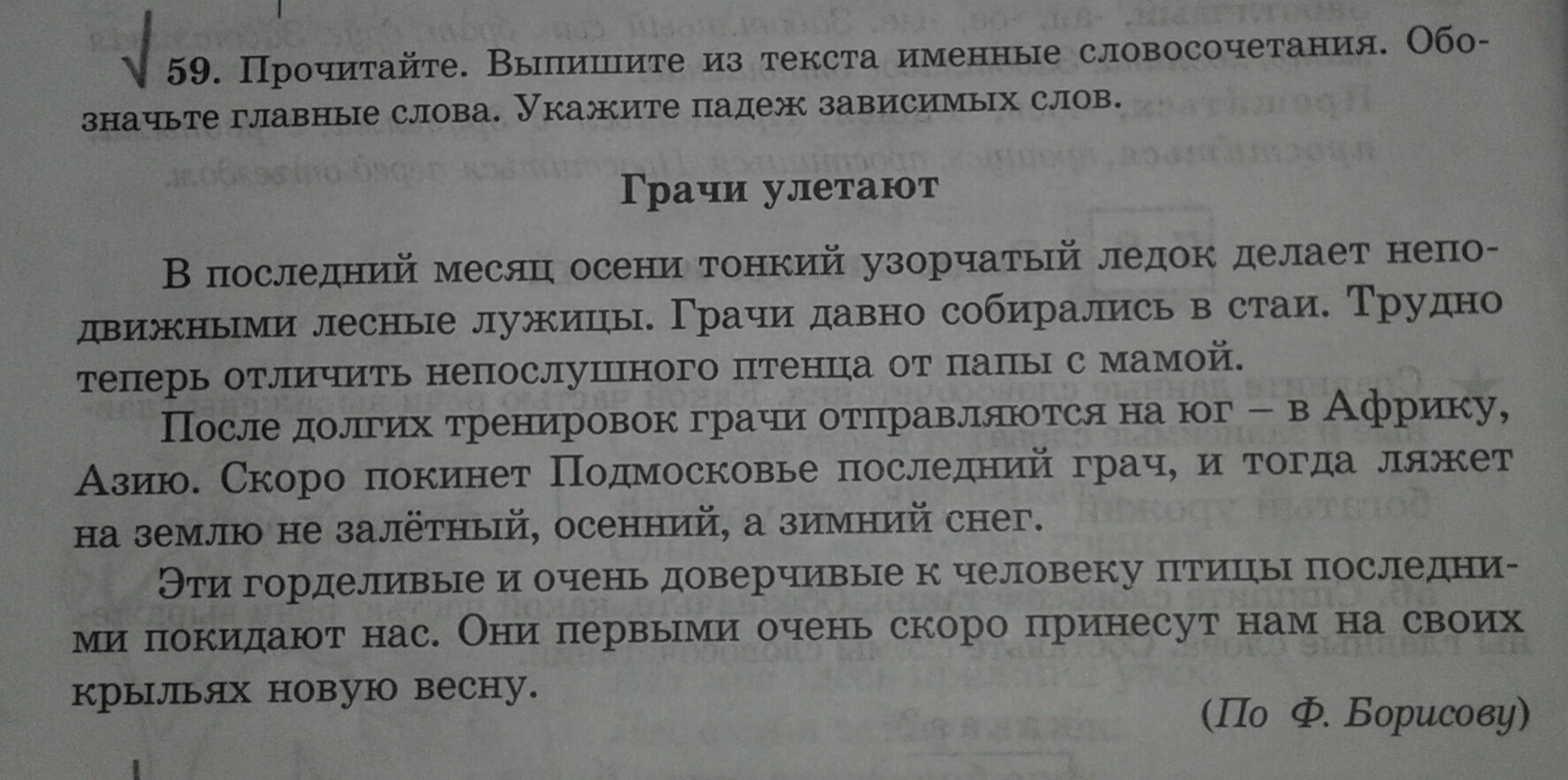 Словосочетания: Месяц(какой?) последний(в.п); месяц(чего?) осени(в.п); ледок(какой?) тонкий и узорчатый(и.п); лужицы (какие?) лесные(р.п); птенец (какой?) непослушный(в.п); тренировок( каких?) долгих(в.п); грач( какой?) последний(и.п); снег(какой?) зимний(и.п);птицы(какие?) горделивые и очень доверчивые(и.п); доверчивые(к кому?) к человеку(д.п); они(какими?) первыми(и.п); весну( какую?) новую(в.п).