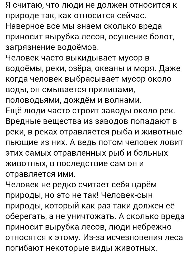 Человек должен относиться к природе бережно. Часто люди загрязняют природу даже не замечая этого! Нужно любить природу и ценить её, ведь природа- это жизнь, воздух которым мы дышим. Без природы не было бы жизни на Земле. Именно природа подарила жизнь и процветание нашей Земле. Поэтому нужно беречь, любить, уважать и ценить природу!К природе нужно относиться так же бережно и с любовью, как и к самому себе. Очень важно ценить и сохранять то, что подарила тебе жизнь. Природа часть нашей с вами жизни. Любите ей, уважайте её и берегите!