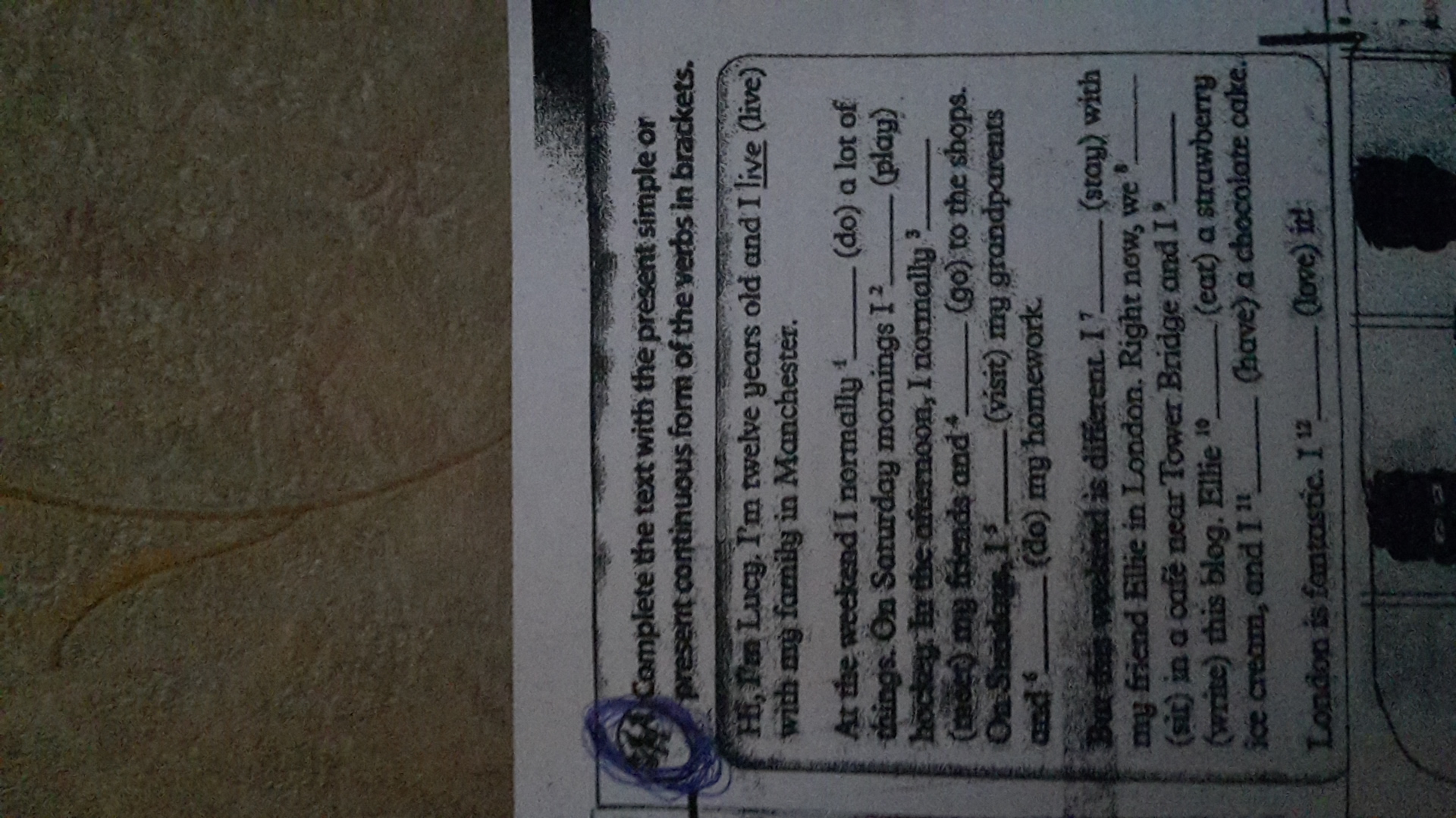 Do,play,meet,go,visit,do, am staying, are sitting, am writing, is eating, am having, love.