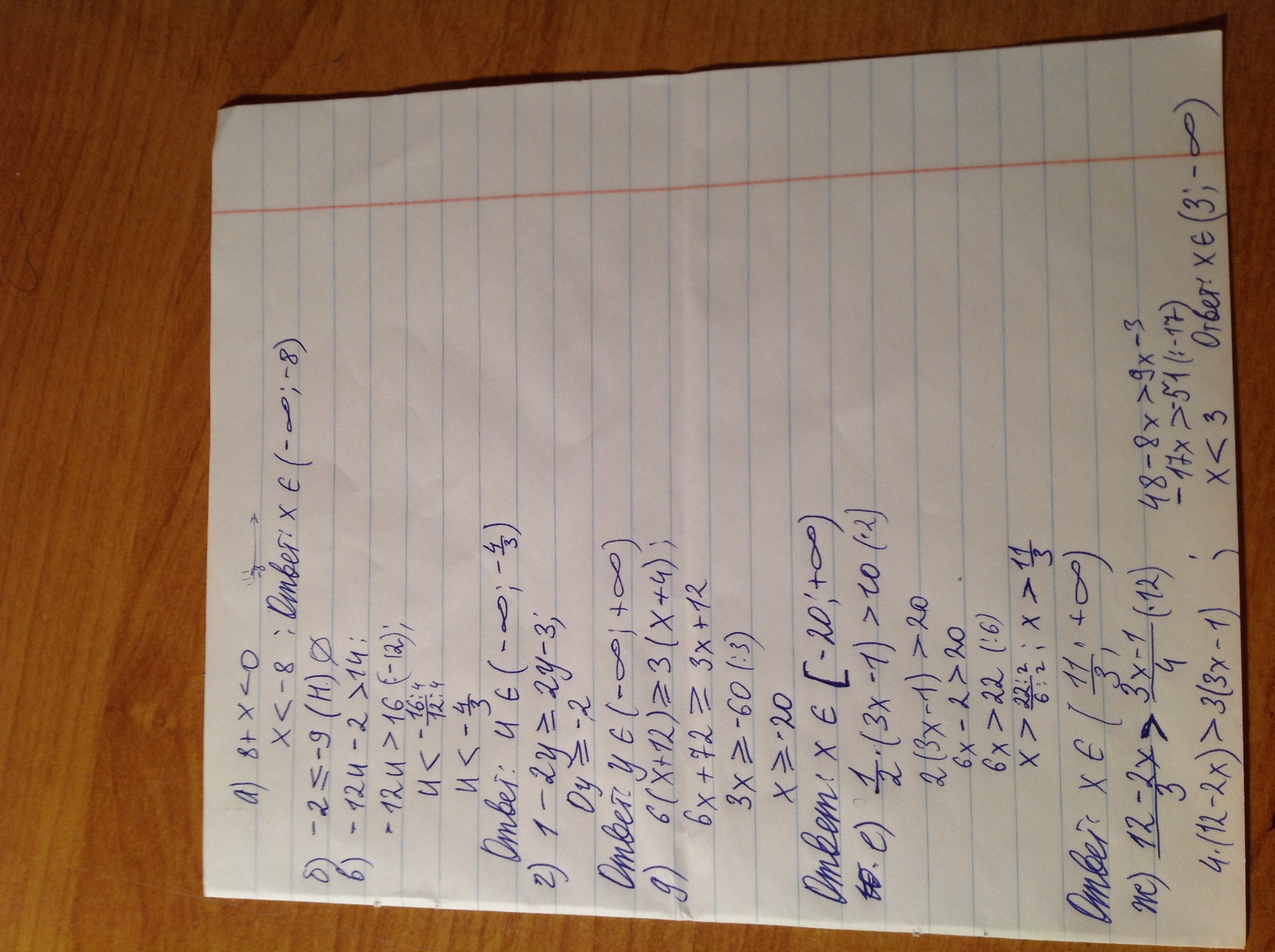 Решите неравенство: а) 8 + x < 0; б) −2 ≤ −9; в) −12u − 2 > 14; г) 1 − 2y ≥ 2y − 3;
