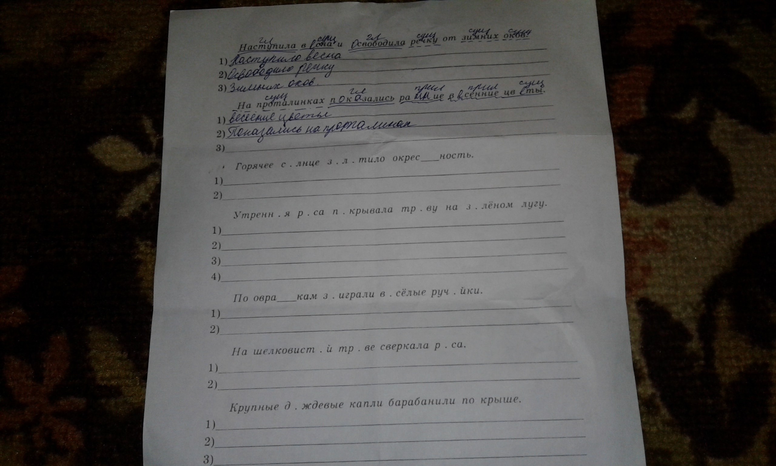 По овражкам(обстоятельство) заиграли(сказуемое) весёлые(определение) ручейки(подлежащее).