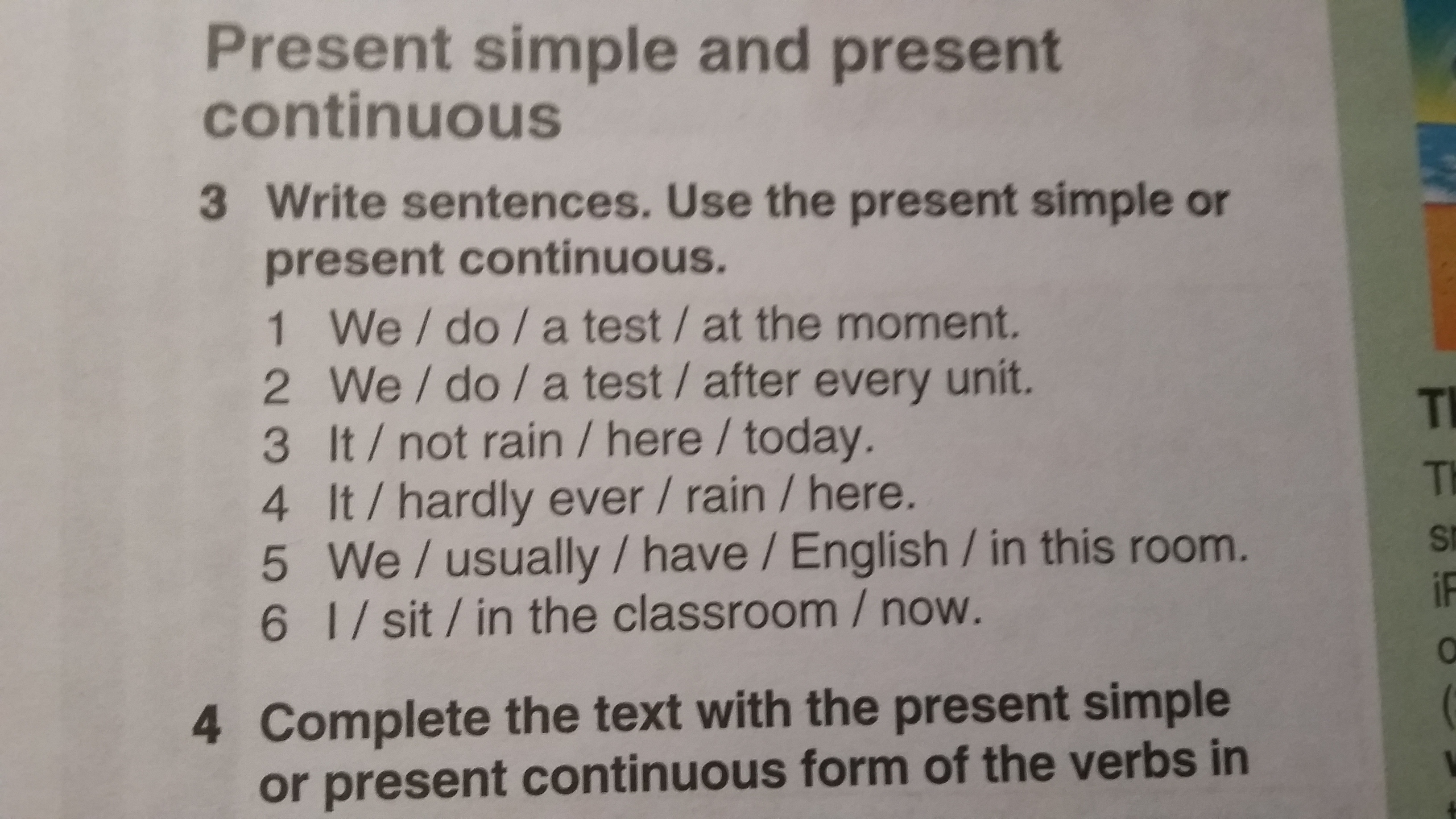 We are doing a test at the moment. We are doing a test after every unit.it is not raining today here.usually we are having english in this room.now im sitting in the classroom