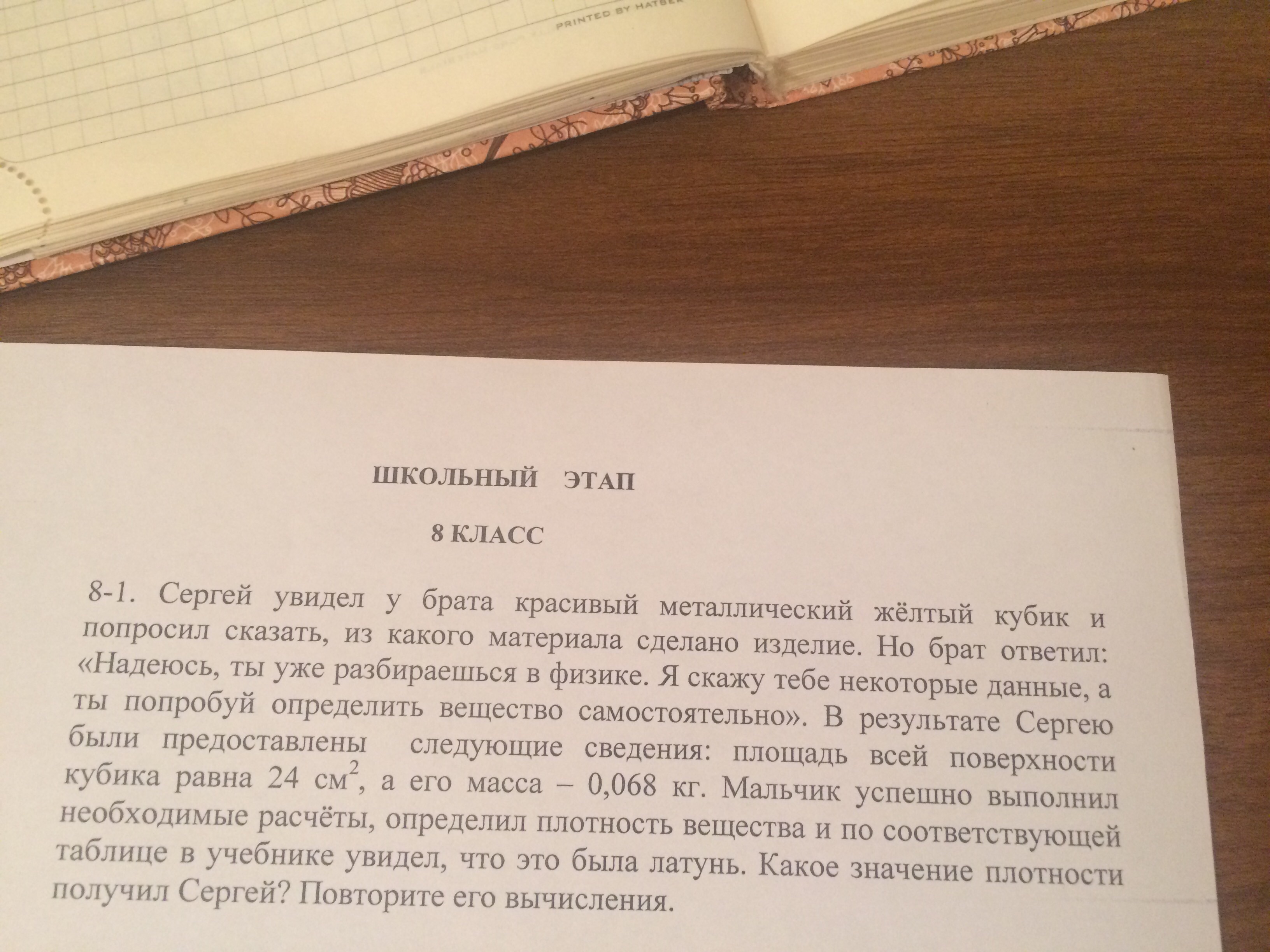 Подставляя вычисленный объём в формулу нахождения плотности, получаем ρ= 0,068/8*10^-6=8500кг/м3.