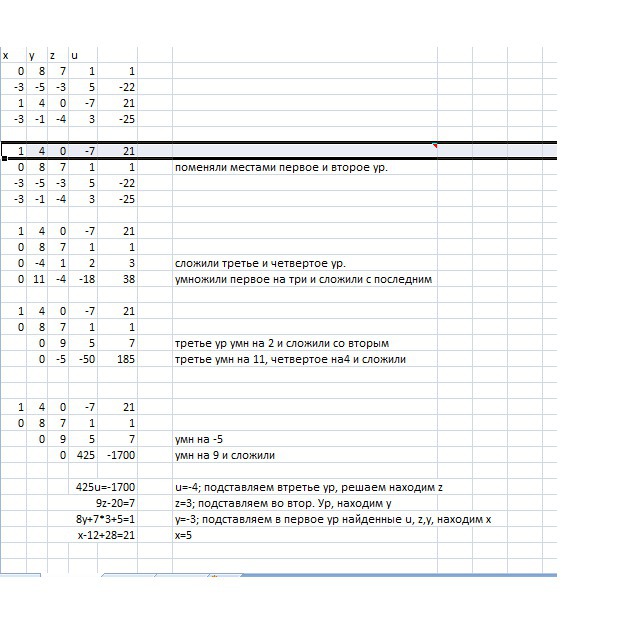 и дальше зная z =3 и u=-4, подставляете во второе уравнение и отсюда находите у=-2 (вот тут я и ошиблась вначале). Теперь значения u,y,z осталось подставить в первое уравнение и получить х.