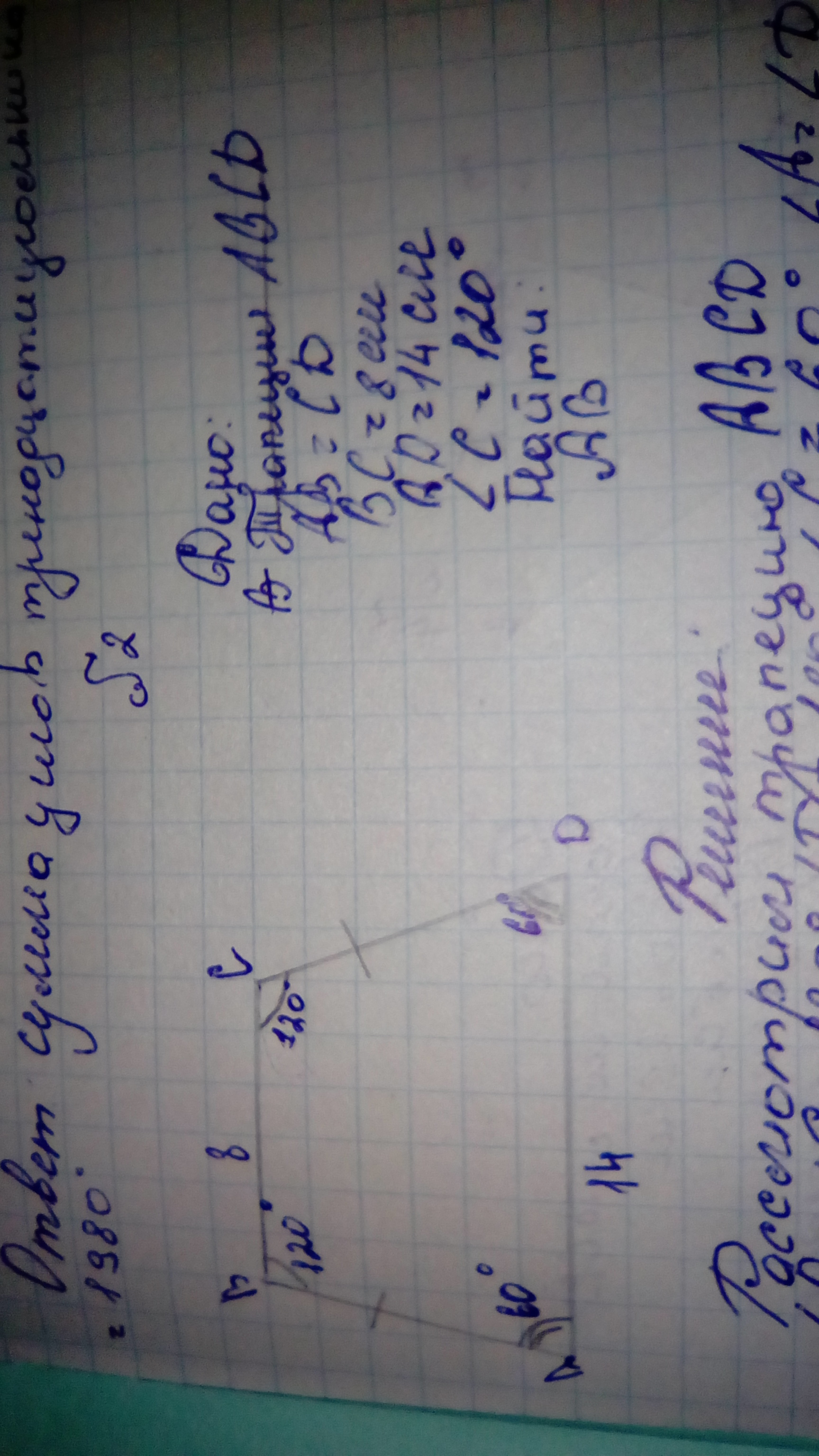 из вершин A и B опустим высоты к основанию AD, образуя точки M и N. Так как трапеция равнобедренная, то AN=DM. Найдем их, для этого из большего основания вычтем меньшее и поделим на два, т.е. AD-BC=14-8=6 и делим на два, получим AN=DM=3. Рассмотрим треугольник ABN- прямоугольный, у него угол N=90 градусов. Найдем угол ABN. ABN=180-(90+60)=30 градусов. AN-катет противолежащий углу 30 градусам, по свойству прямоугольного треугольника он равен половине гипотенузы. тогда AB=6