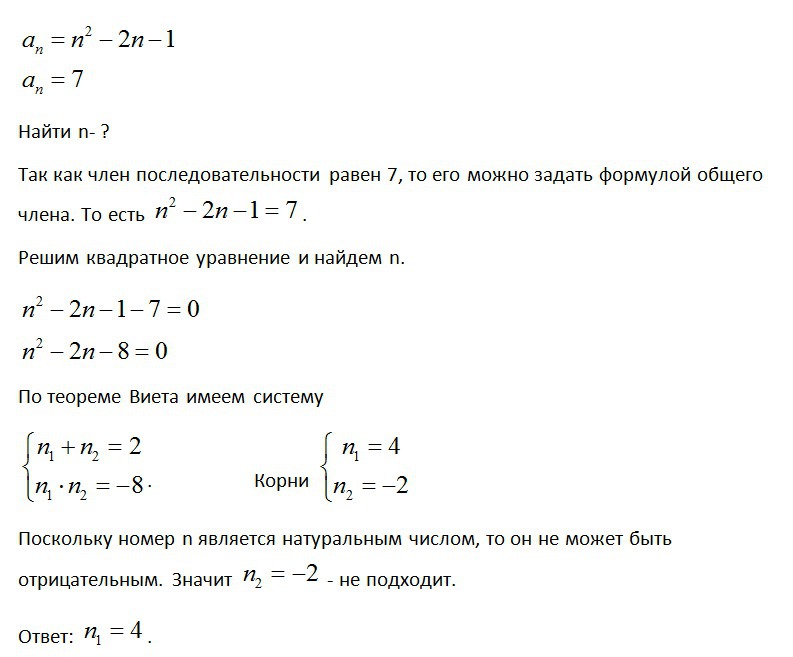 Последовательность an задана формулой an=n^2-2n-1. Найдите номер члена последовательности равного 7.