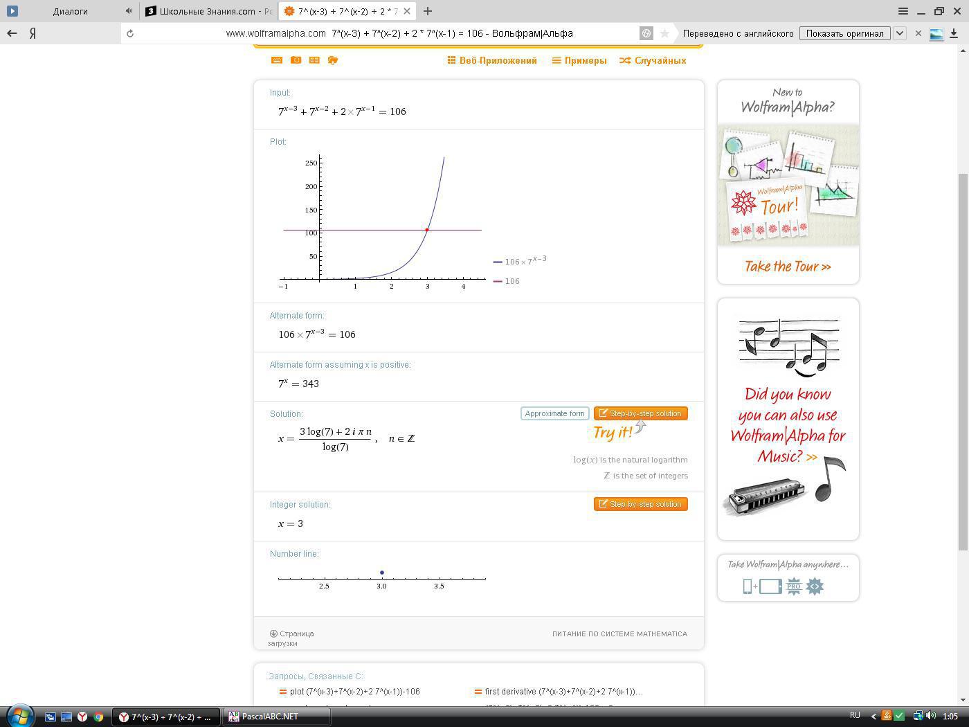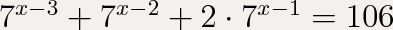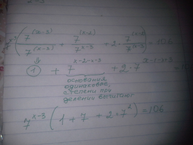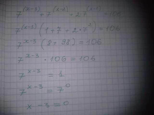 Уравнение:7^(x-3) + 7^(x-2) + 2 * 7^(x-1) = 106