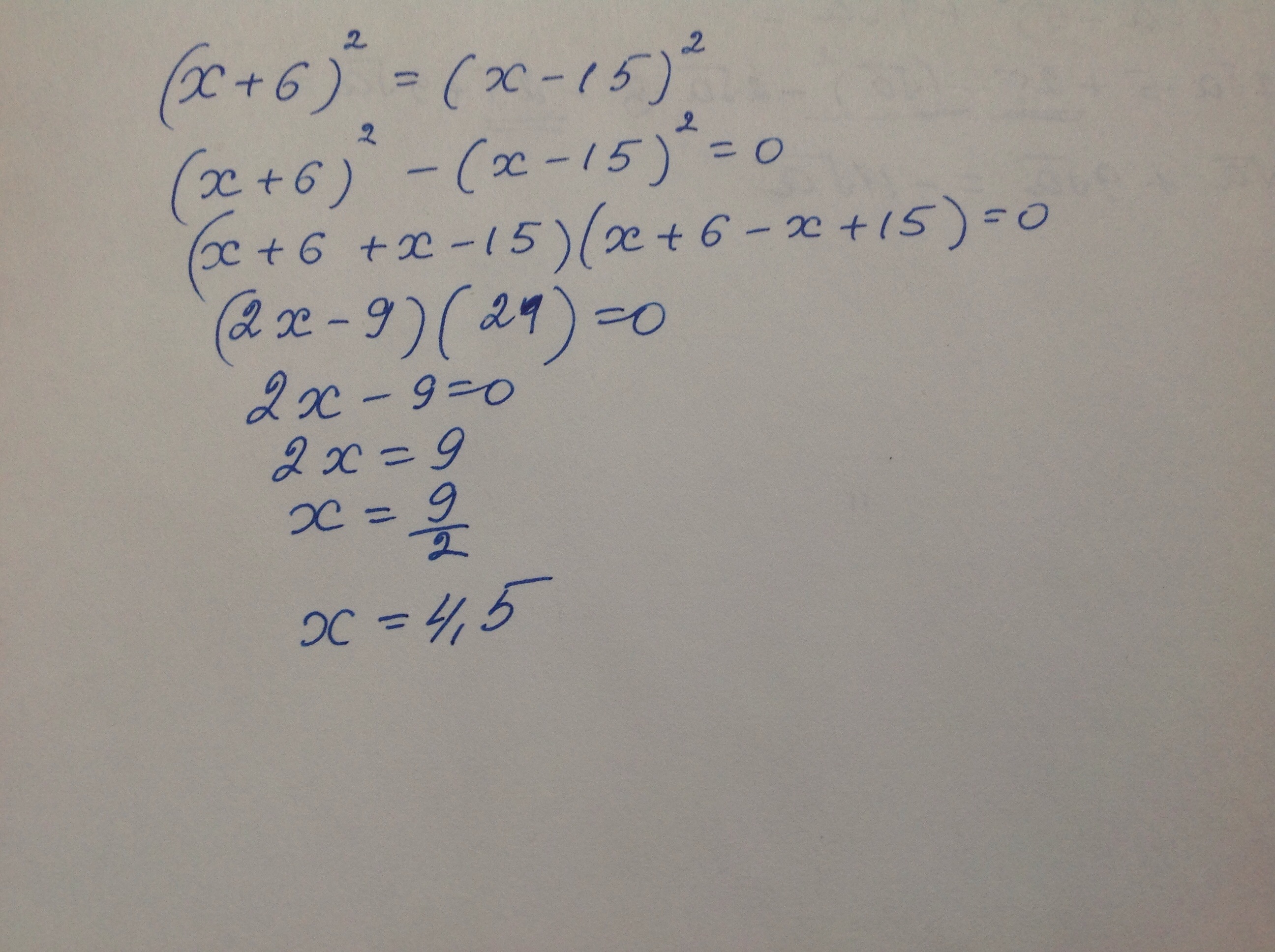 найдите корень уравнения (x+6)^2=(x-15)^2