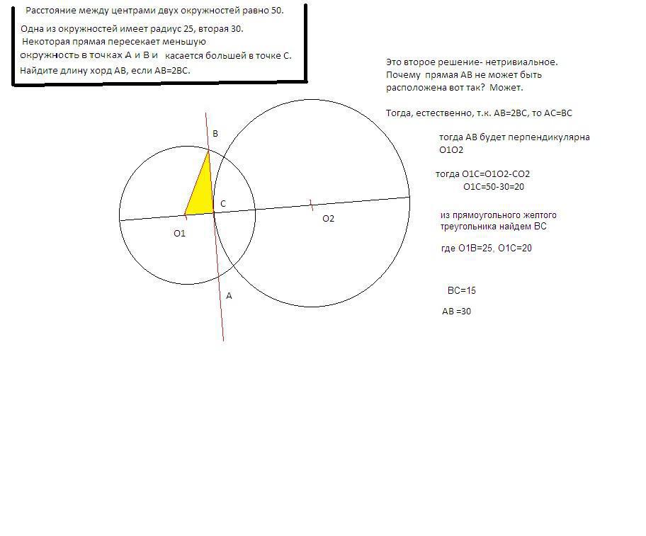 Расстояние между центрами двух окружностей равно 50 см. Одна из них имеет радиус 25 см, другая 30 см. Некая прямая пересекает меньшую окружность в точках А и В, касаясь большей окружности в точке С.
