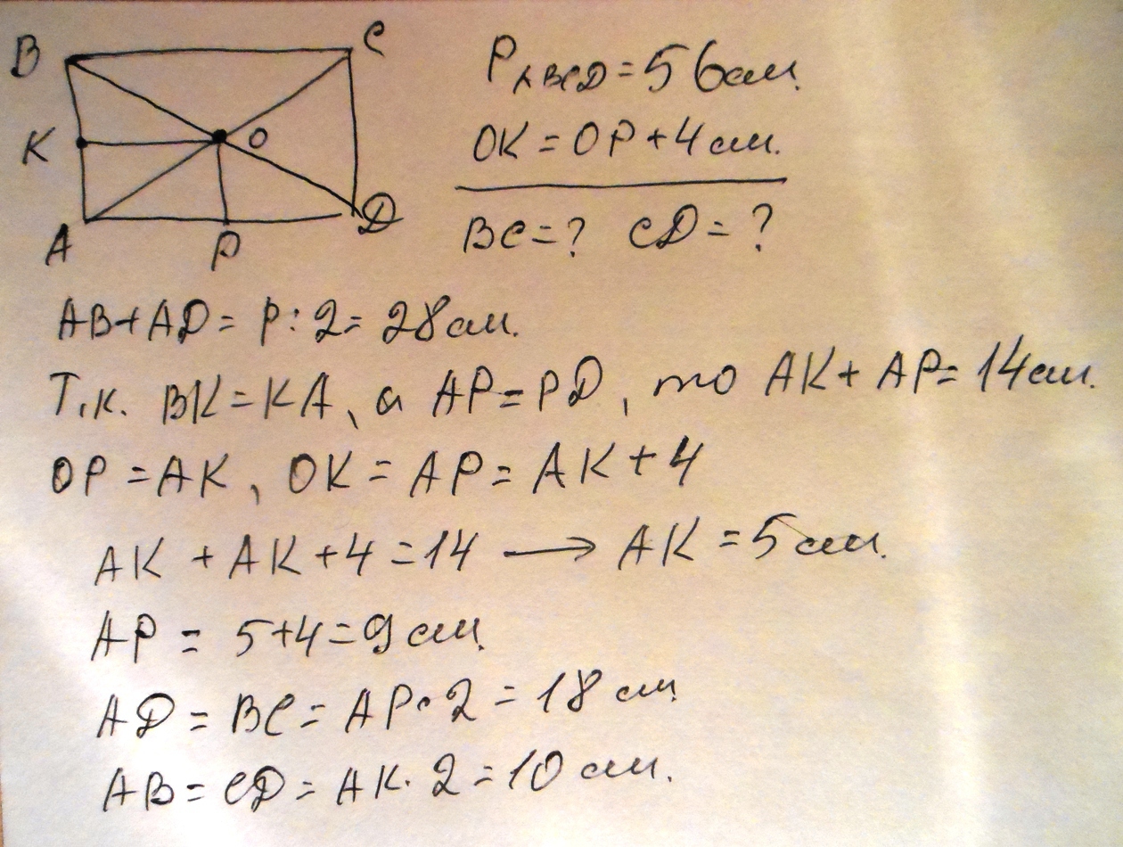В прямоугольнике точка пересечения диагоналей отстоит от меньшей стороны на 4 сантиметра дальше, чем от большей стороны. Периметр прямоугольника равен 56 сантиметров. Найдите его стороны