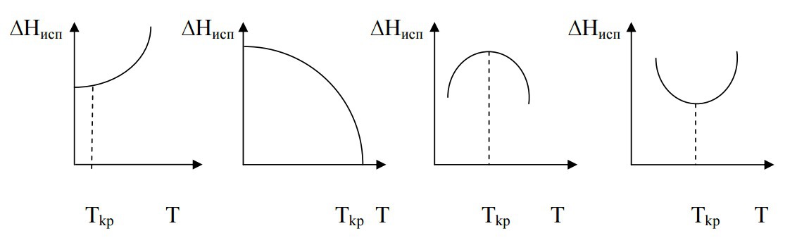 Если я правильно понимаю и помню, то правильный второй график, где ΔHисп уходит в нуль с ростом Т. Дело в том, что при температурах выше критической нет разницы между жидкостью и паром (газом). А значит, теплота переход (теплота испарения, теплота парообразования ΔH) должна быть равной нулю. Иначе был бы парадокс - пар и жидкость неотличимы, а для перехода нужна энергия - то есть разница все-таки есть.