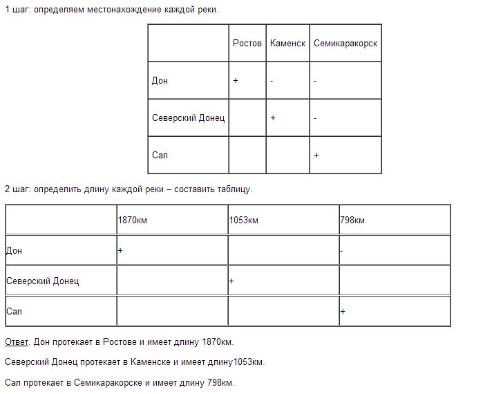 Три реки Дон, Северский Донец и Сал протекают в городах Семикаракорск, Ростов, Каменск. Северский Донец протекает не в Семикаракорске, а Дон не в Каменске и не в Семикаракорске. Река Ростова имеет длину не 798 км. Та река, которая течет в Каменске длиной 1053км. Определите местонахождение и длину каждой реки.