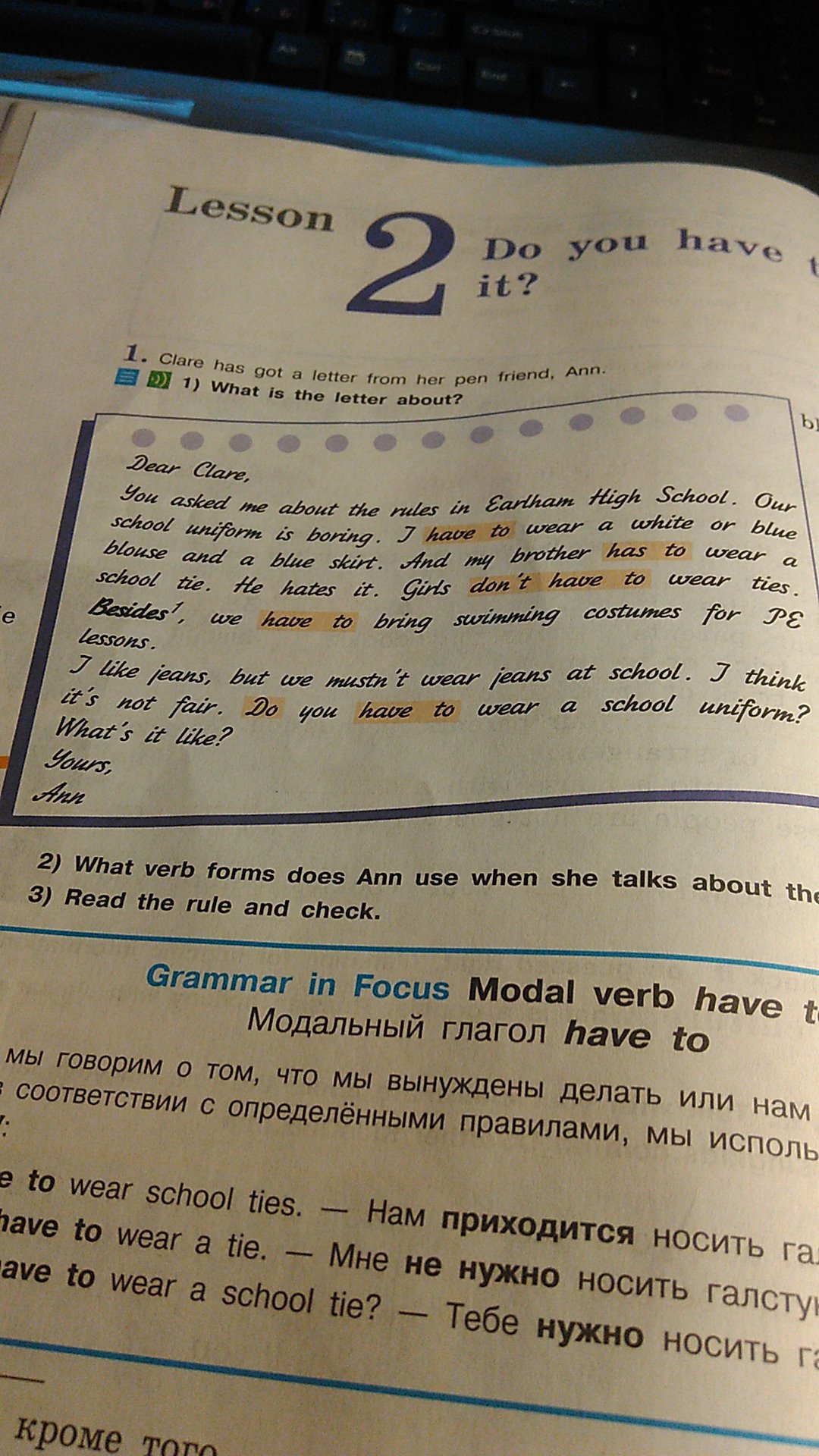Ты спрашивала меня о правилах Eartham High School. Наша школьная форма очень скучная.мне приходится носить белую или голубую рубашку. А моему брату приходится носить галстуки.К роме того, нам придется носить купальные костюмы для уроков плавания. Мне нравится джинсы но мы не должны надевать их в школу. Я думаю это нечестно А тебе приходится носить школьную форму?Какая она