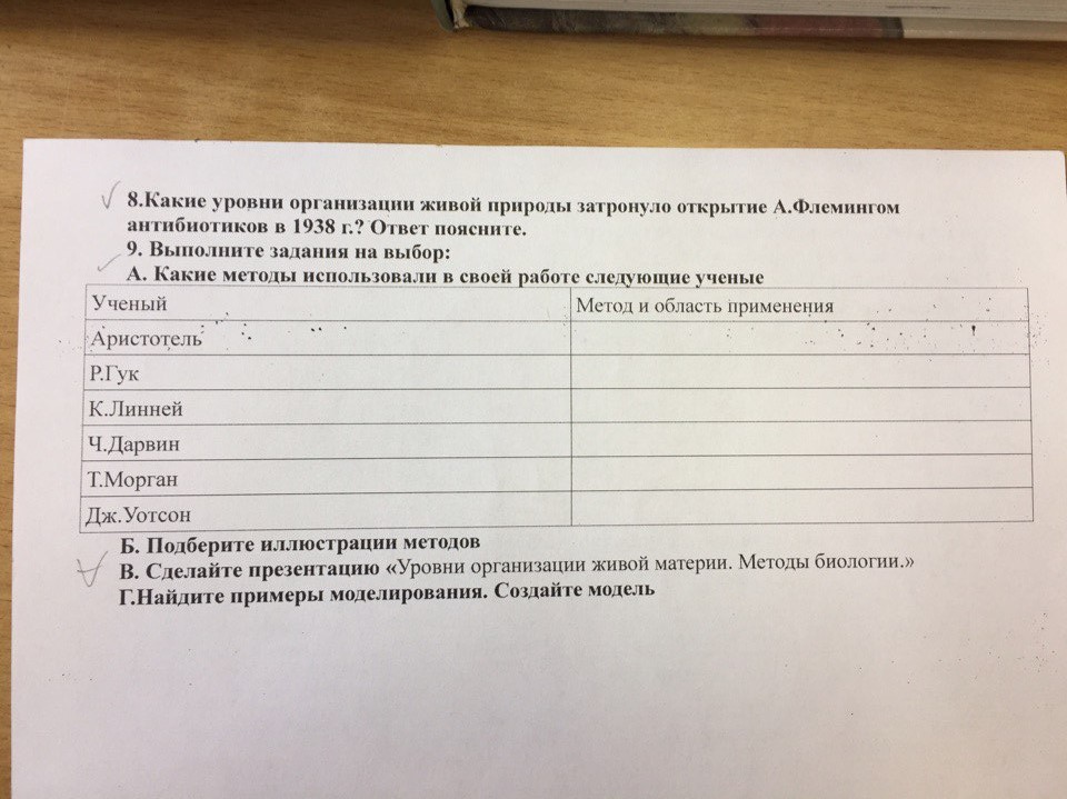 Гук описание, Мендель -эксперимент,гибридологический ,гинеалогический, Дарвин- скорее всего палеонтологический и генеалогический, Аристотель- наблюдение, описание, Линней- наблюдение, описание Уотсон- открыл ДНК, наверное описание, наблюдение, эксперимень, а вообще цитогиненический метод