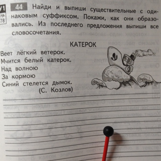 Слова с одинаковыми суффиксами: кормою, дымок. Как преобразовывались: за кормою дымок (сама уже не помню). Словосочетания: Стелется дымок
